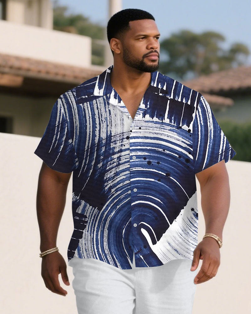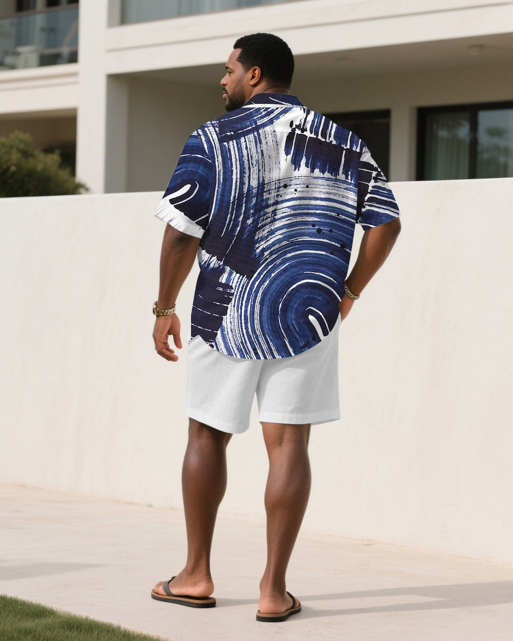 Men's Plus Size White & Blue Large Brush Graffiti Art Short Sleeve Shirt Shorts Suit