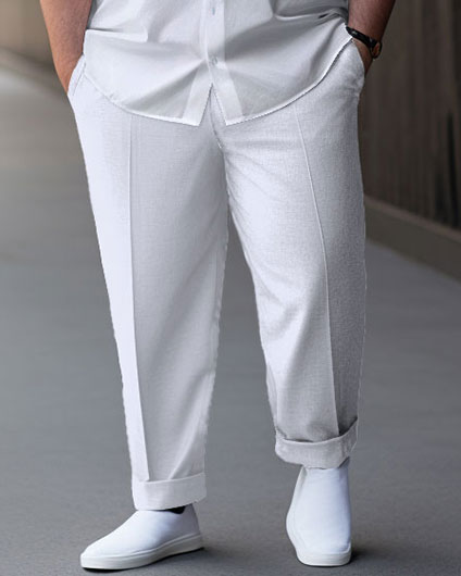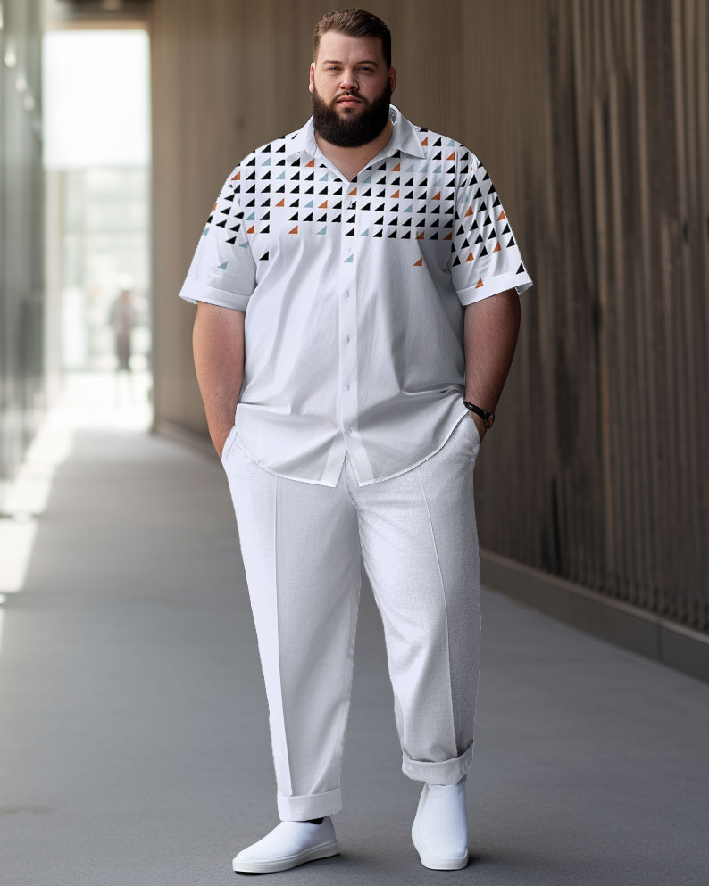 If you want a clean look, this men's ensemble meets your wish. The pure white base is thoughtfully adorned with geometric triangle prints, striking the balance between simplicity and formality. With its body-inclusive loose fit, this versatile piece easily transitions to various occasions.