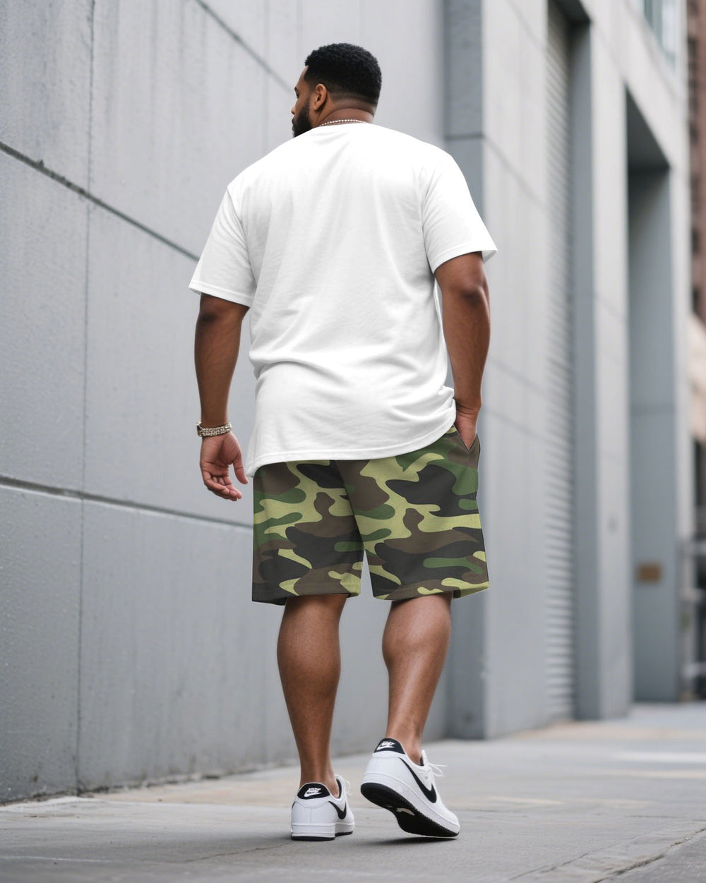 Men's Plus Size White & Green Camouflage Headphones Fashion Round Neck Short Sleeve T-shirt Shorts Suit