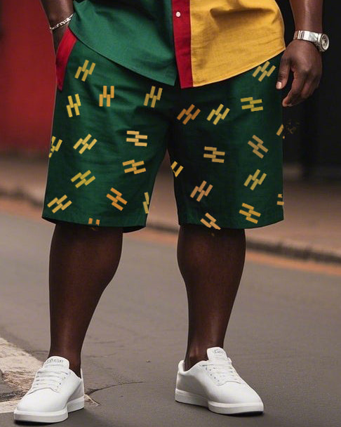 Men's Plus Size Yellow Green Stitching Shirt Chain Shorts Printed Shirt Suit