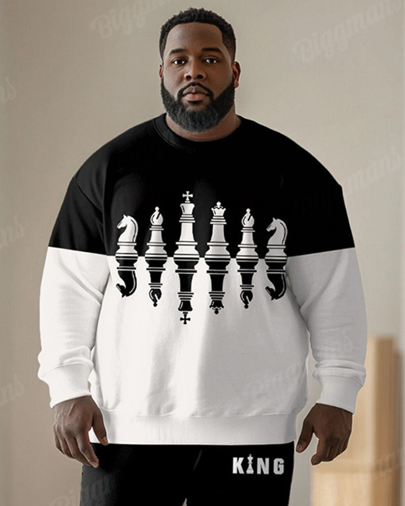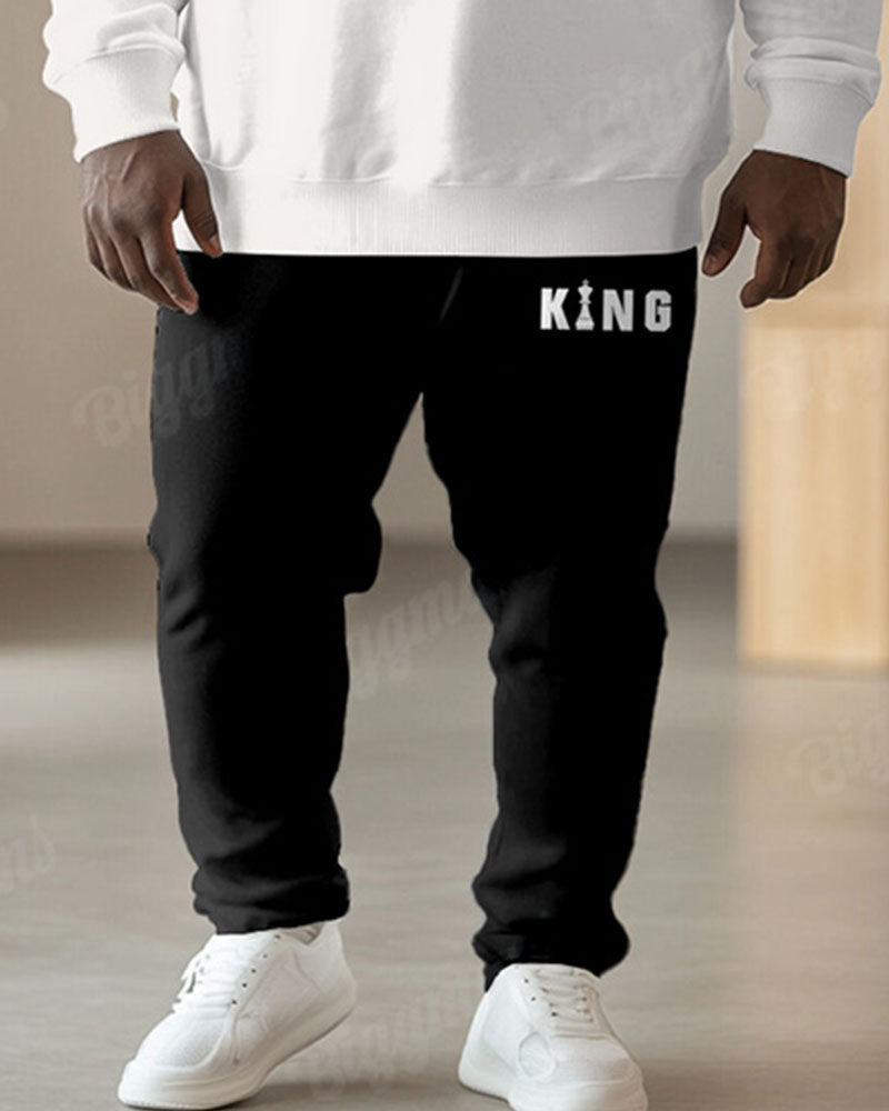 Men's Simple Black And White Color Block King Letter Print Plus Size Round Neck Sweatshirt Suit