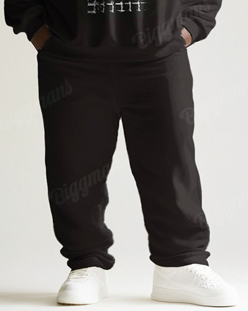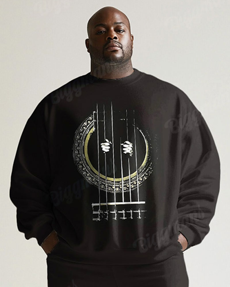 Men's Simple Black Retro Pattern Musical Instrument Print Plus Size Round Neck Sweatshirt Suit