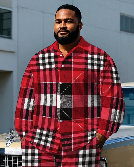 Men's Simple Fashion Red Plaid Printed Daily Casual Big & Tall Long Sleeve Shirt Pants Set