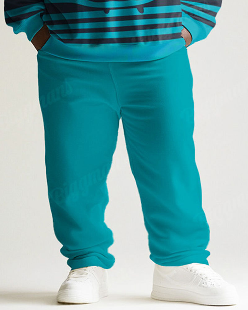Men's Simple Green Stripe Cartoon Print Plus Size Round Neck Sweatshirt Suit