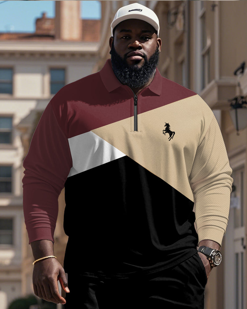 Men's Simple Wine Red Khaki Black Color Block Printed Zipper Polo Shirt Trousers Suit