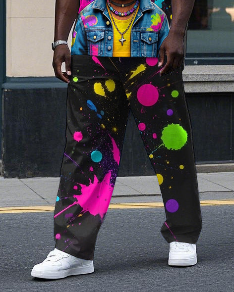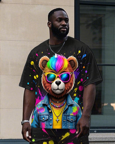 Men's Splash Graffiti Cool Bear Printed Street Fashion Short Sleeve T-shirt Pants 2-Piece Set
