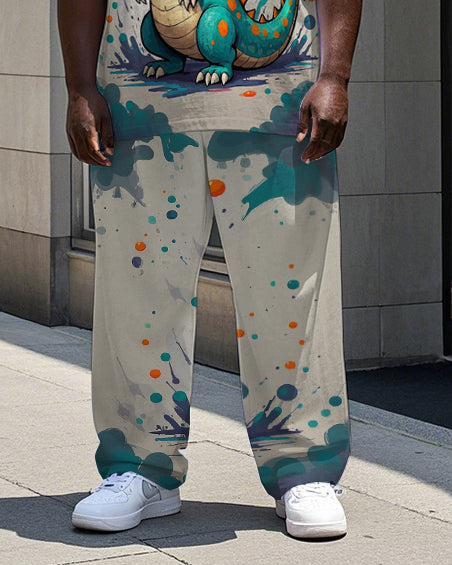 Men's Splash Ink Cute Dinosaur Printed Street Fashion 2-Piece Short Sleeve T-shirt Pants Set