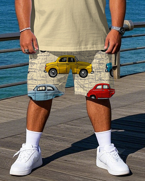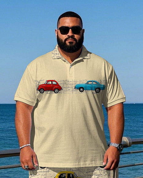 Men's Street Style Artistic Cartoon Car Printed Big & Tall Short Sleeve Polo Shirt Shorts Set