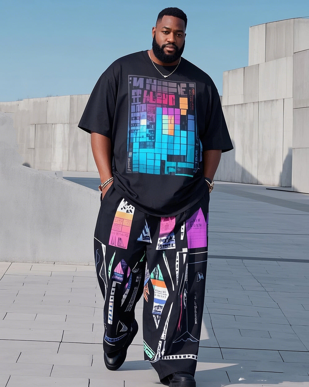 Plus Size 1 L-9L Men's Tetris. Irregular Print Casual Short-sleeved T-shirt Pants Suit