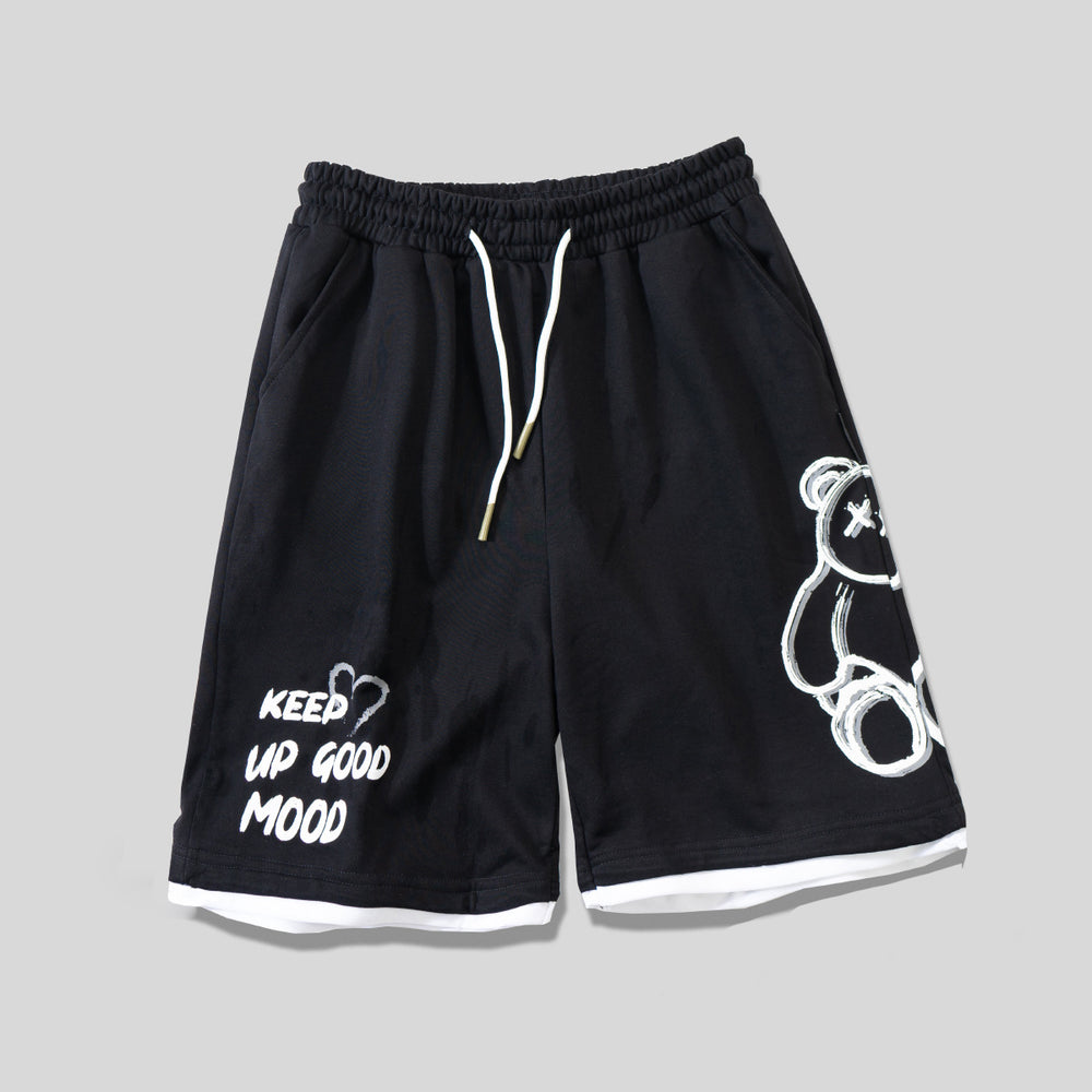 Highlighting a fake two-piece design, these are available in black or gray. They feature an elastic waistband with an adjustable drawstring and functional pockets. They are adorned with playful bear and letter prints, exuding a hip-hop vibe and ideal for multiple occasions.