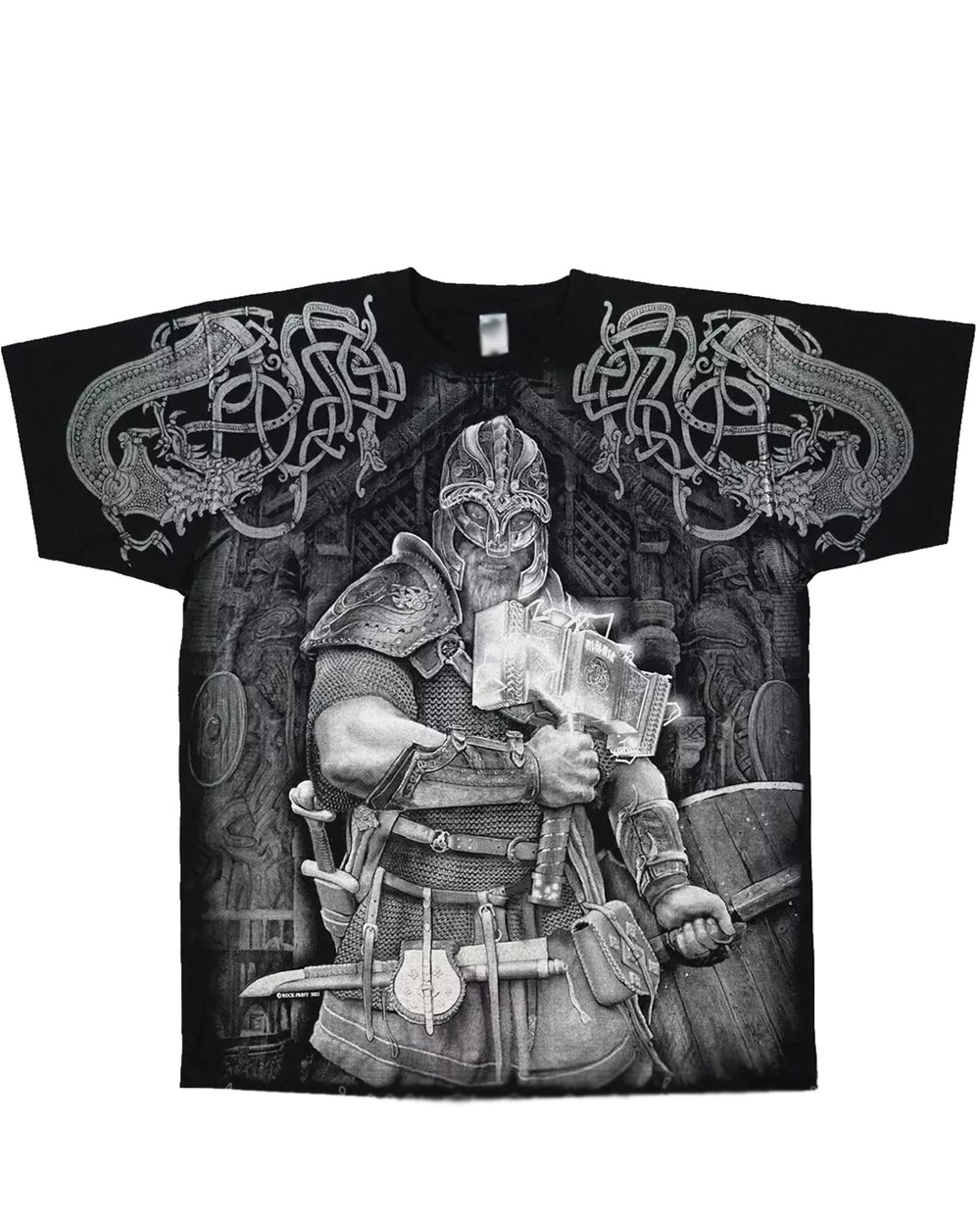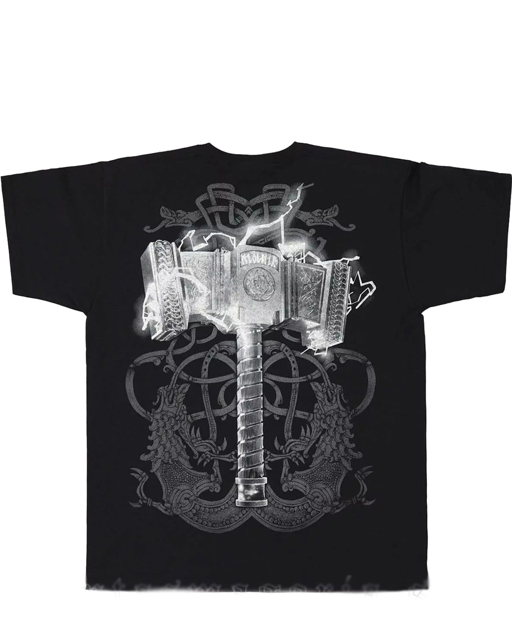 Plus Size Black Printed T-shirt With Quake Mjolnir Pattern Black T-shirt. Printed Front And Back