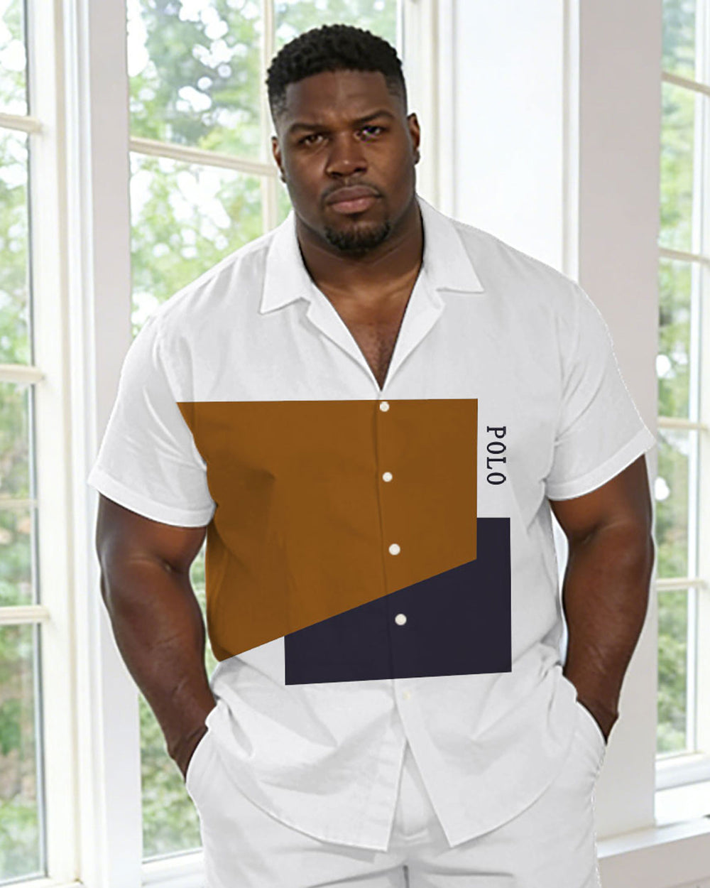 Plus-size Men’s White Contrast-color Short-sleeve Shirt And Pants Set