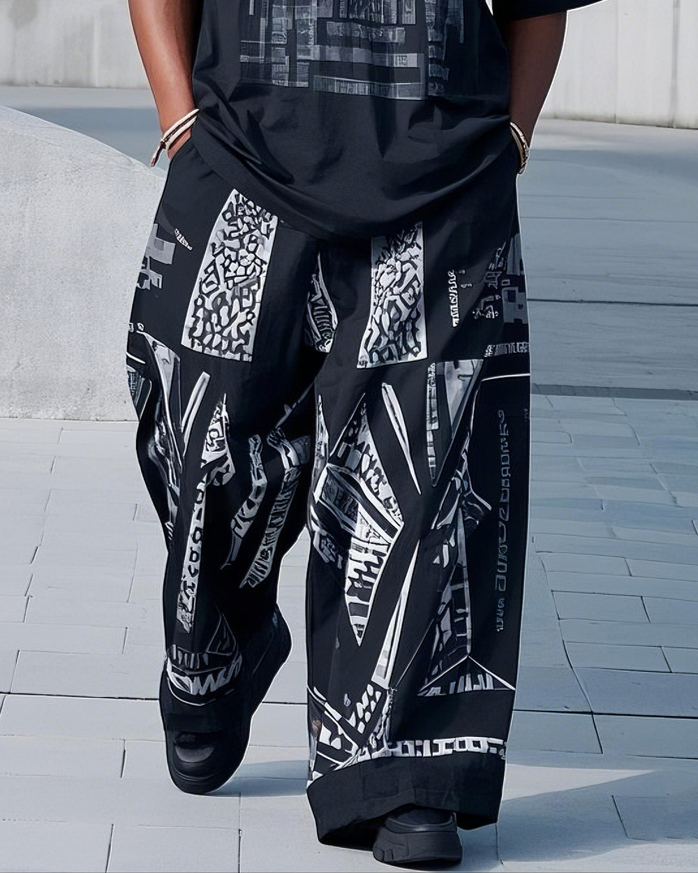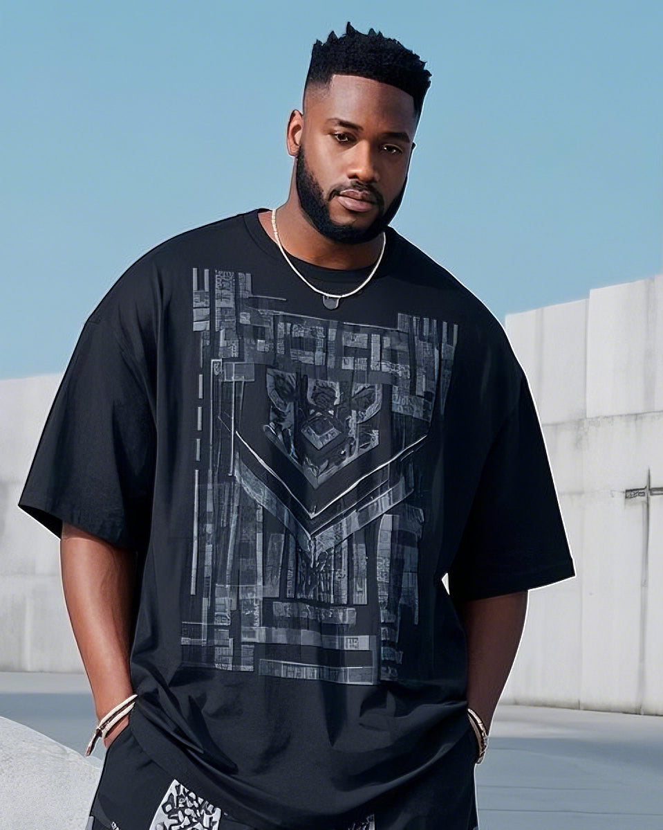 Plus Size Men's Black And White Printed Casual Short-sleeved T-shirt Pants Suit