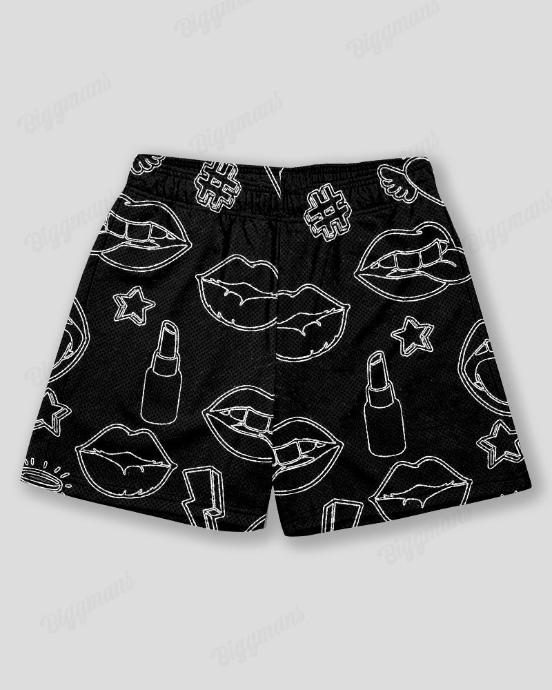 Plus Size Men's Black Slogan Lip Graffiti Print Sports Mesh Quick Dry Shorts