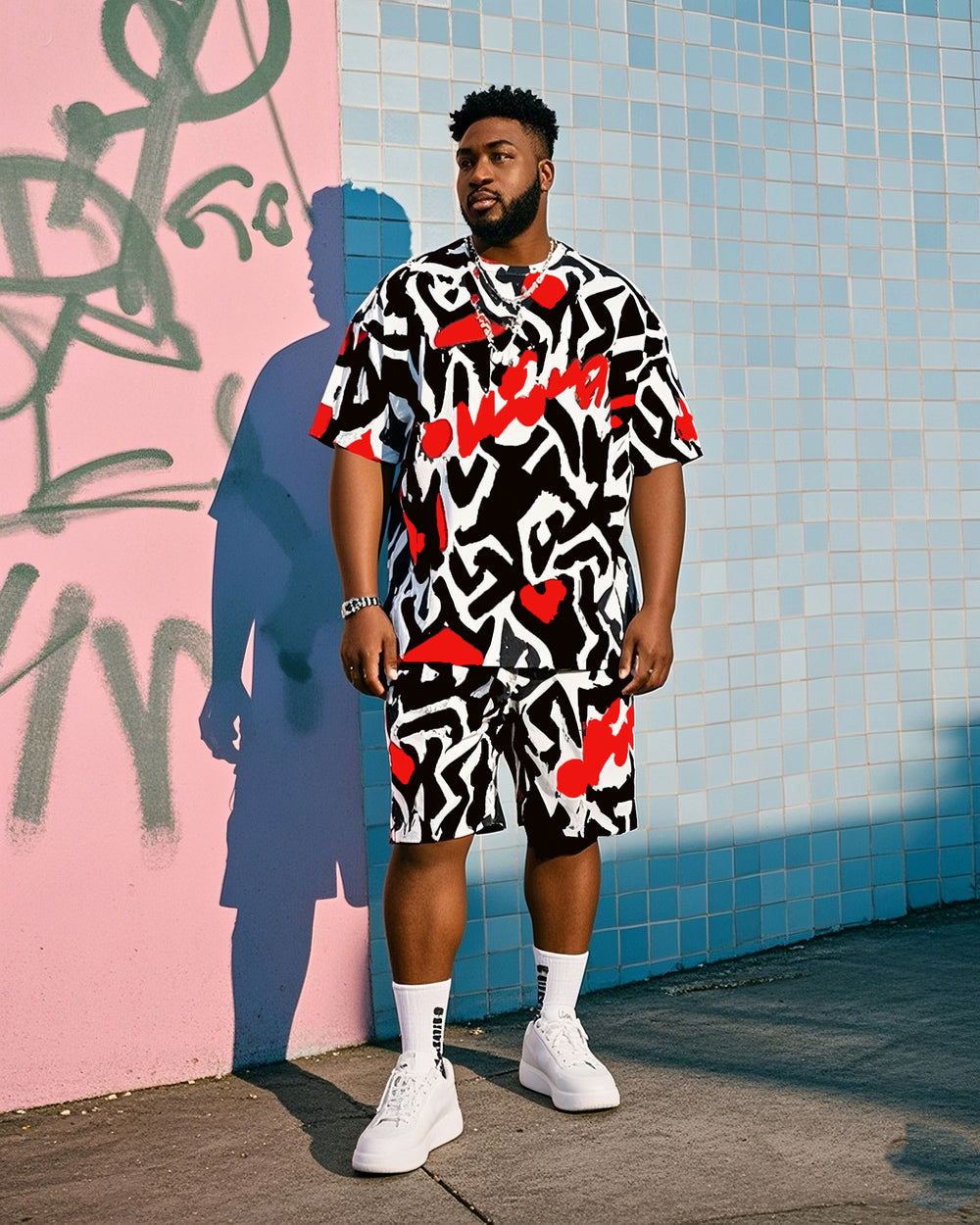 Plus Size Men's Creative Graffiti Print T-shirt Shorts Suit