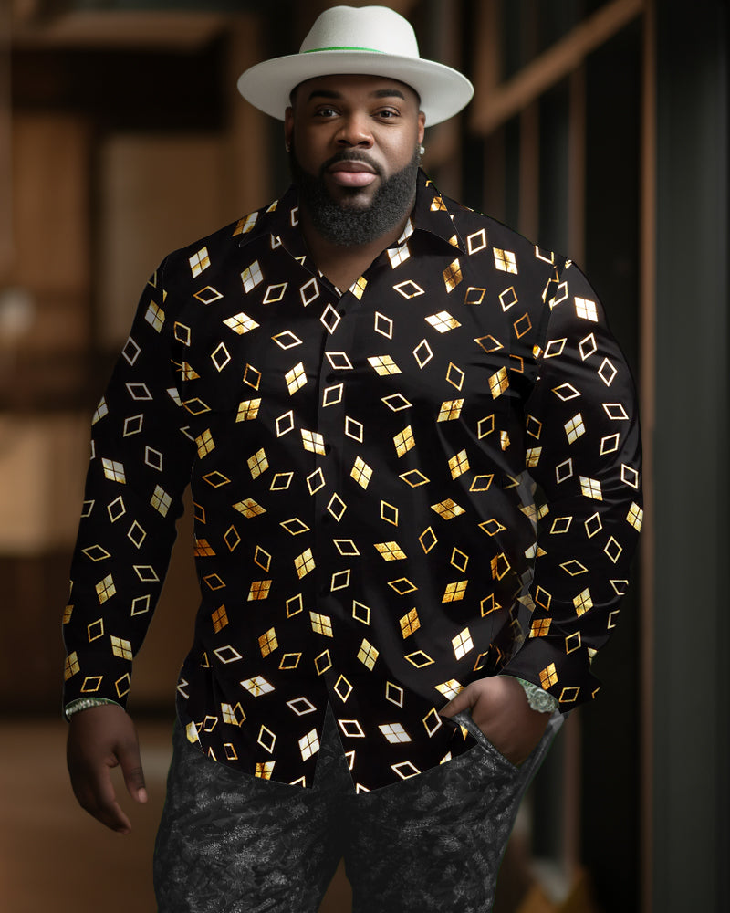 Plus Size Men's Fashion Golden Square Pattern Printing Lapel Long Sleeve Shirt