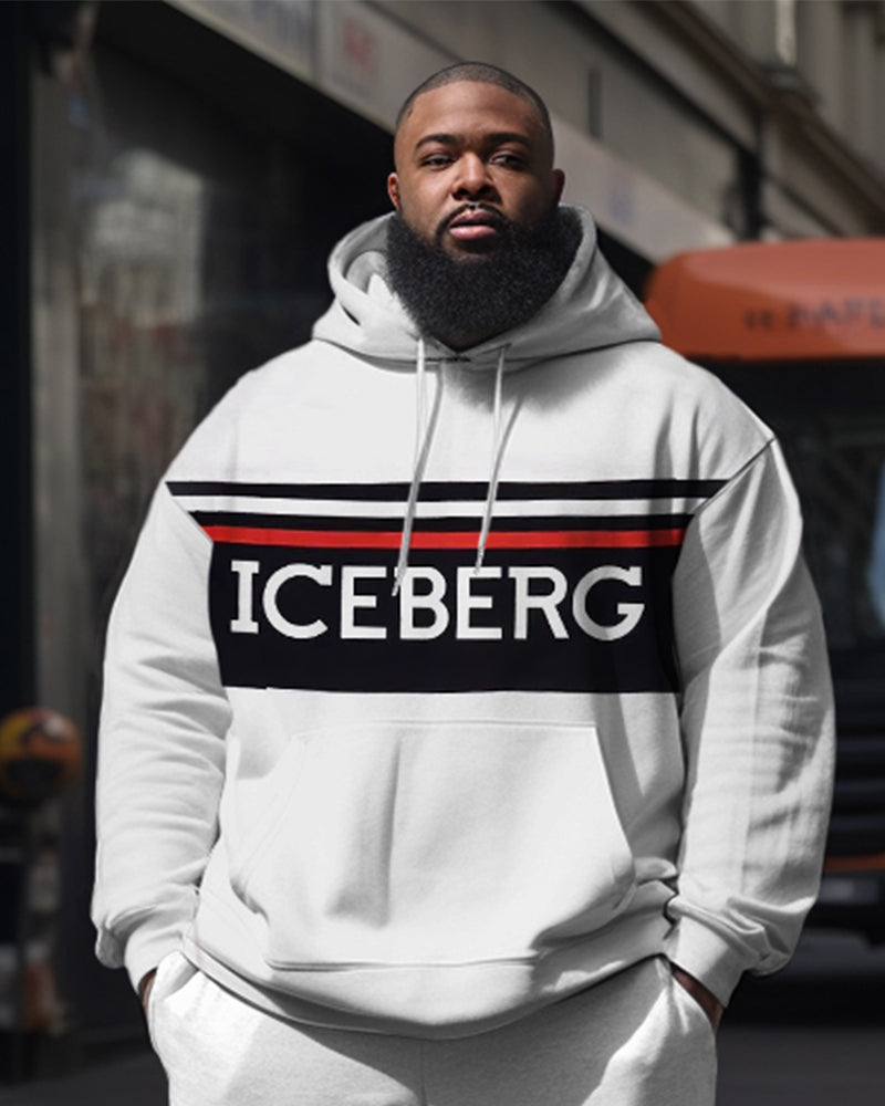 Versatile and practical, this big and tall men's white hoodie set features black and red color-blocking with line designs. The "ICEBERG" lettering adds a trendy touch, making this outfit a fashionable choice for any casual occasion. With a loose fit for ultimate comfort, this set is perfect for layering or wearing on its own.