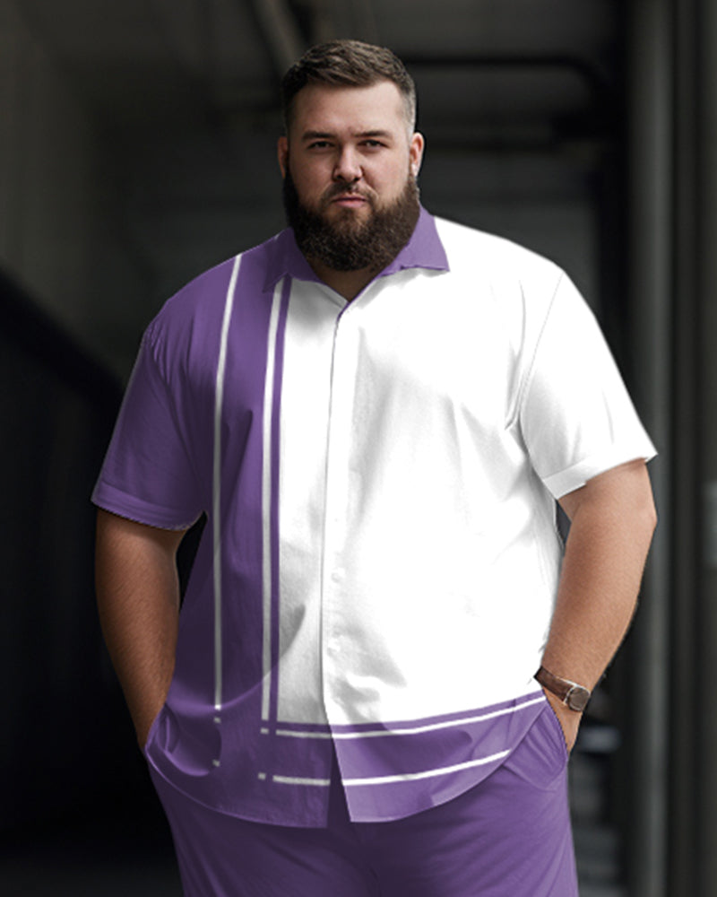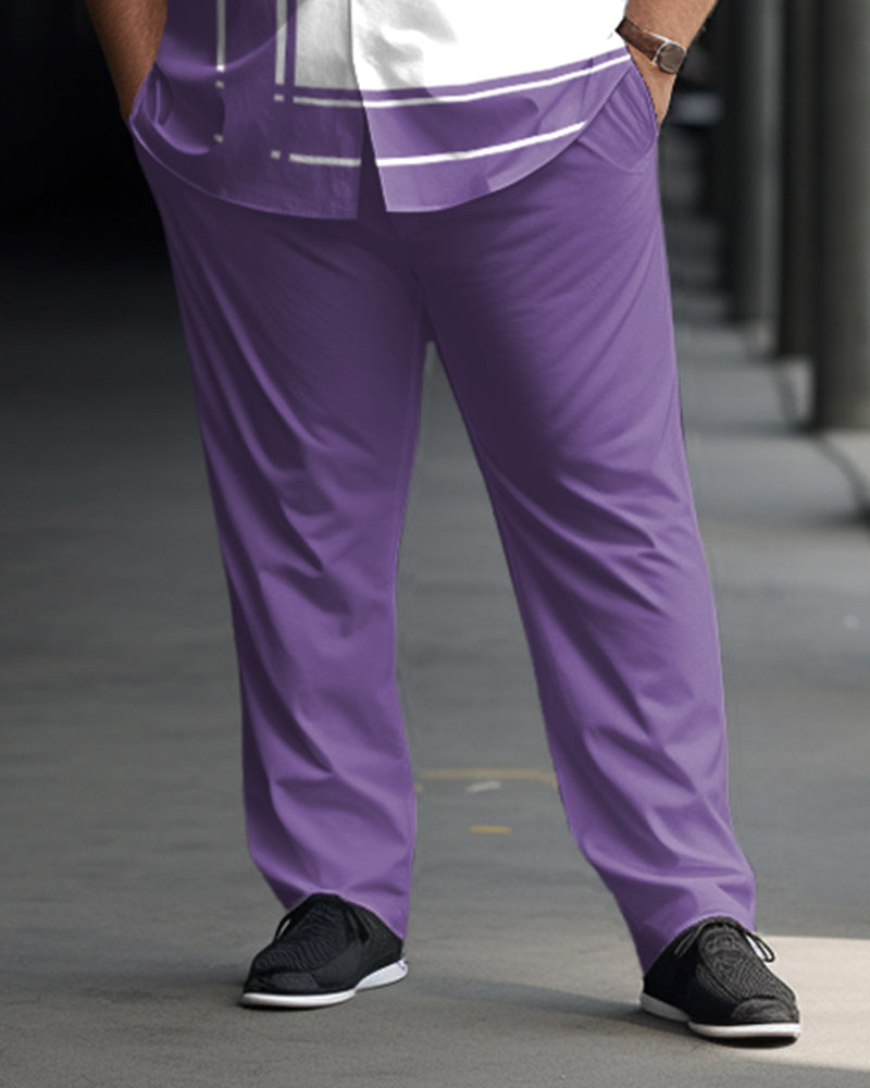 This big & tall men's features a purple and white splicing style. It embodies elegance while maintaining comfort through its relaxed fit. Perfect for summer-to-fall transitions, the ensemble blends professional polish and contemporary style. Modern and elegant, it exemplifies gentlemanly sophistication.