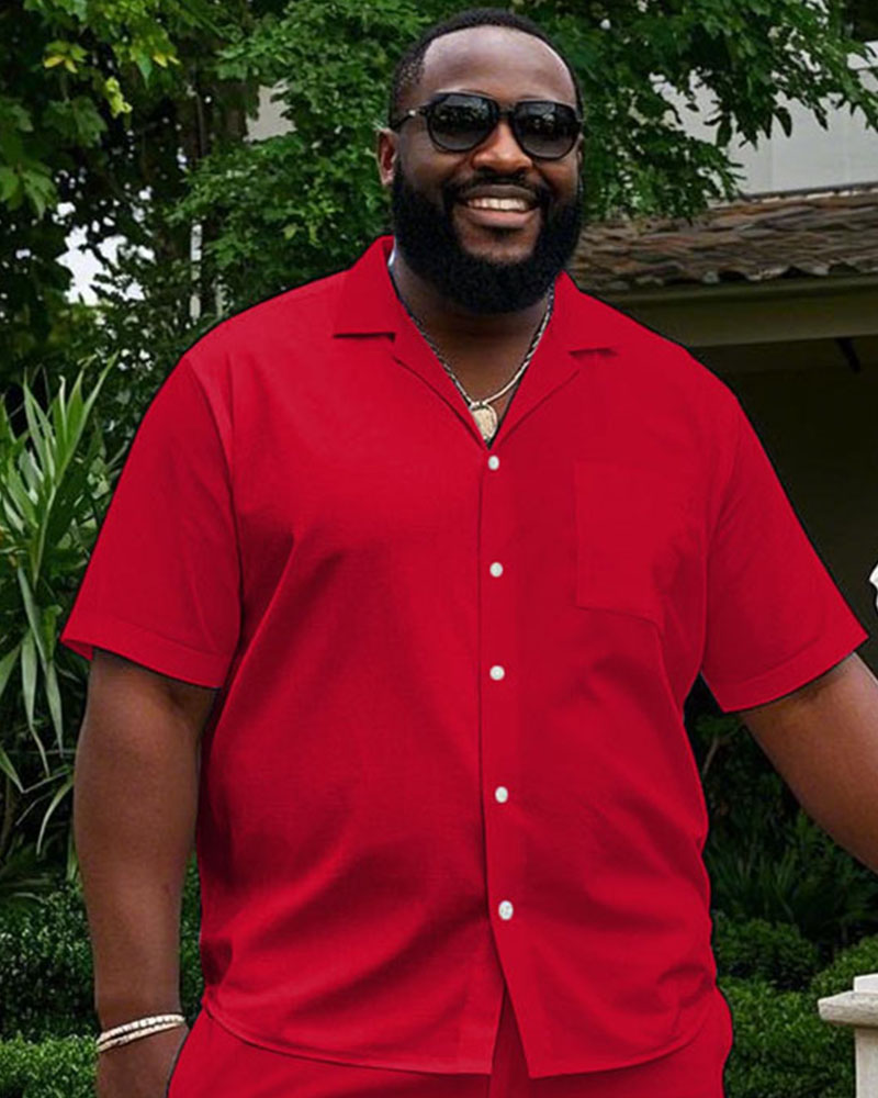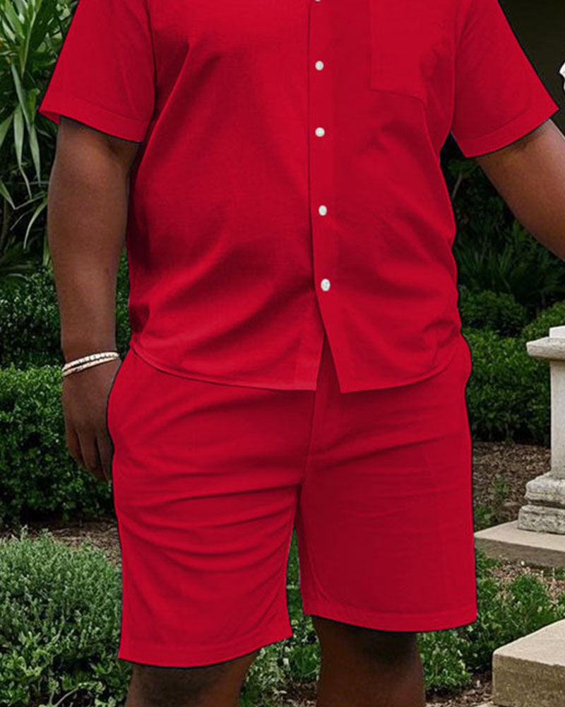 -Red Solid Color Basic Cuban Collar Short Sleeve Shirt Shorts Set