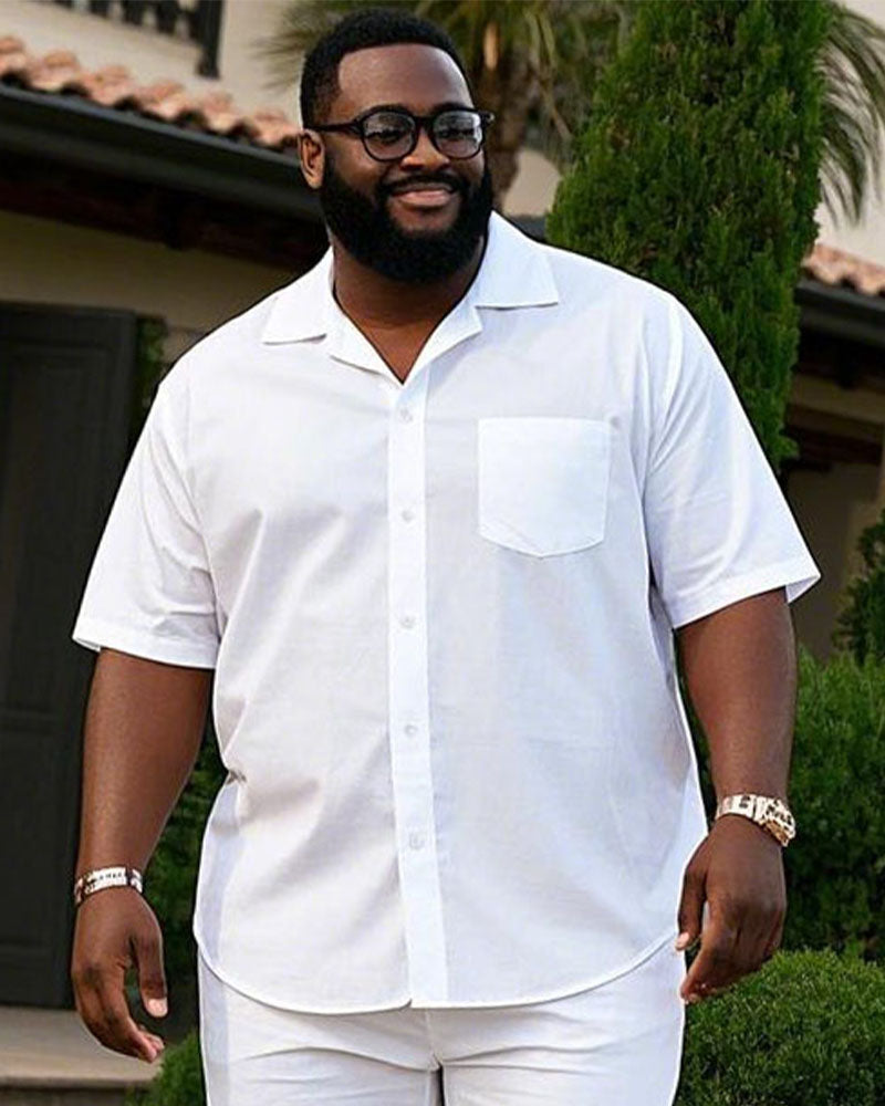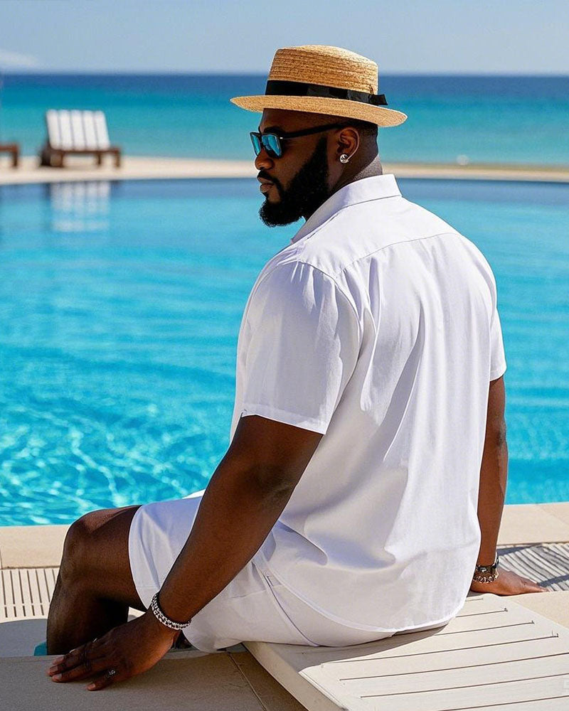 -White Solid Color Basic Cuban Collar Short Sleeve Shirt Shorts Set
