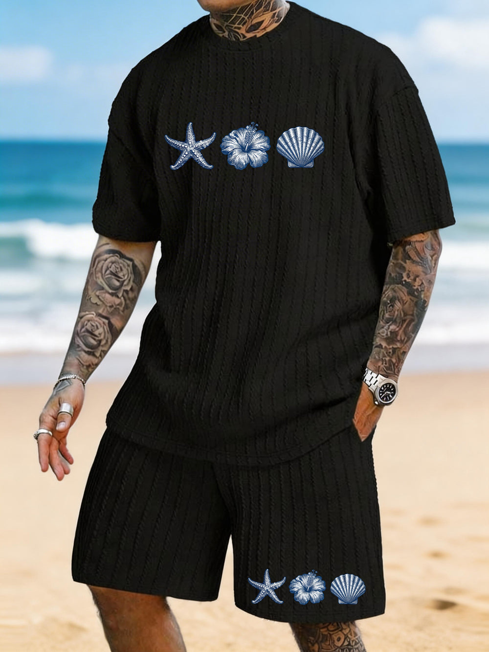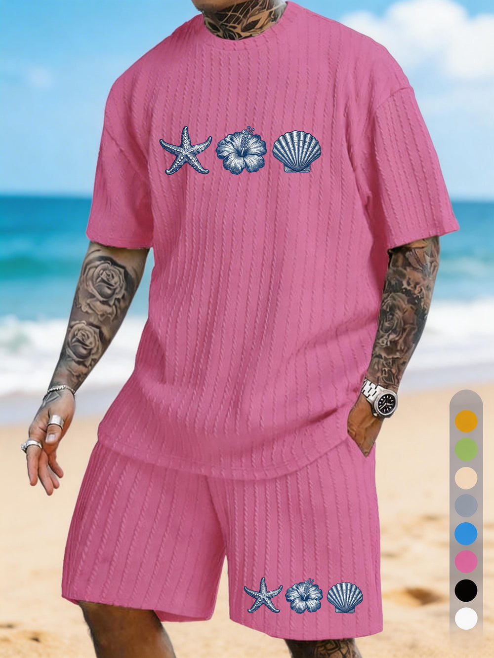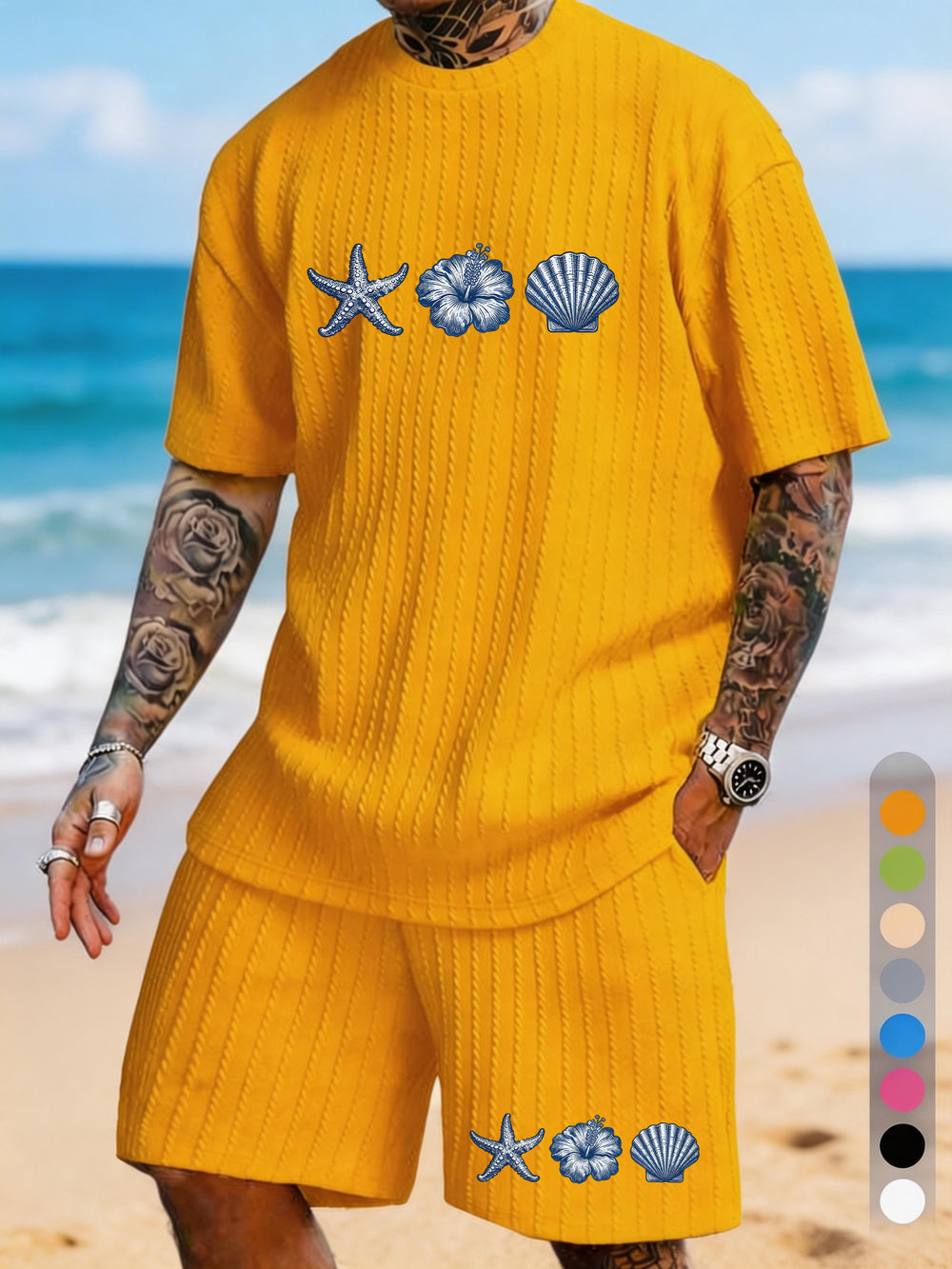 Starfish Shell Hibiscus Flower Printed Texture Pattern Plus Size Seaside Casual Suit
