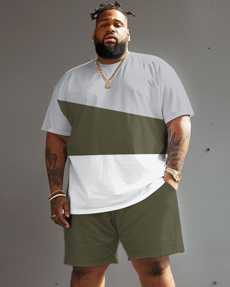 This men's short-sleeved T-shirt and shorts set adopts a color block . Made of gray, army green, and white stripes, this set shows a simple yet individual style. It can be easily controlled whether it is daily leisure or outdoor activities. This versatile set can be flexibly matched with other items, making it a practical choice for summer wear.