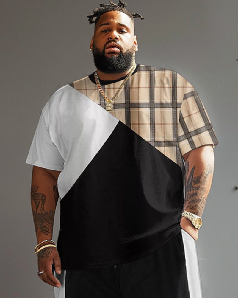 This men’s big & tall two-piece set blends khaki plaid with black and white color block. Designed with a loose fit, this set offers comfort and ease, making it ideal for casual days. Its minimalist style and streetwear vibe are easy to mix and match with other pieces, providing versatile options for various occasions.