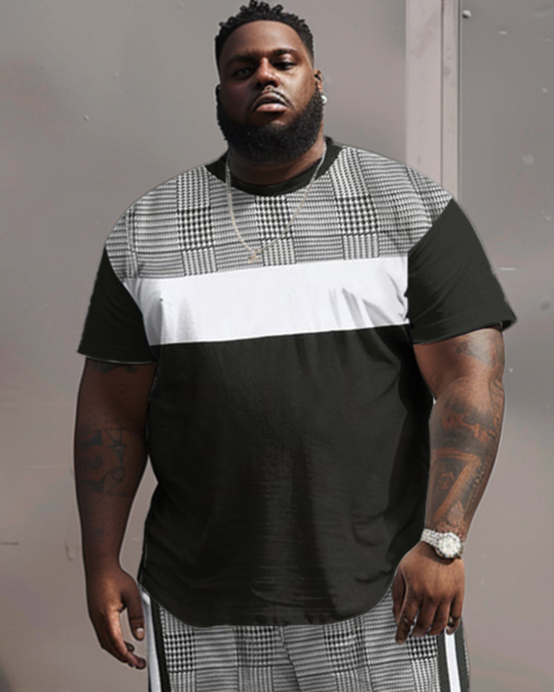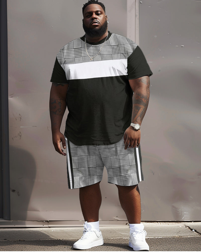 This men's short-sleeved T-shirt and shorts set features a classic black and white style, with a checkered and striped color block design and modern design elements, showing the unique charm of street style. With a loose fit and various matching ways, this versatile set allows you to flexibly show different fashion styles.