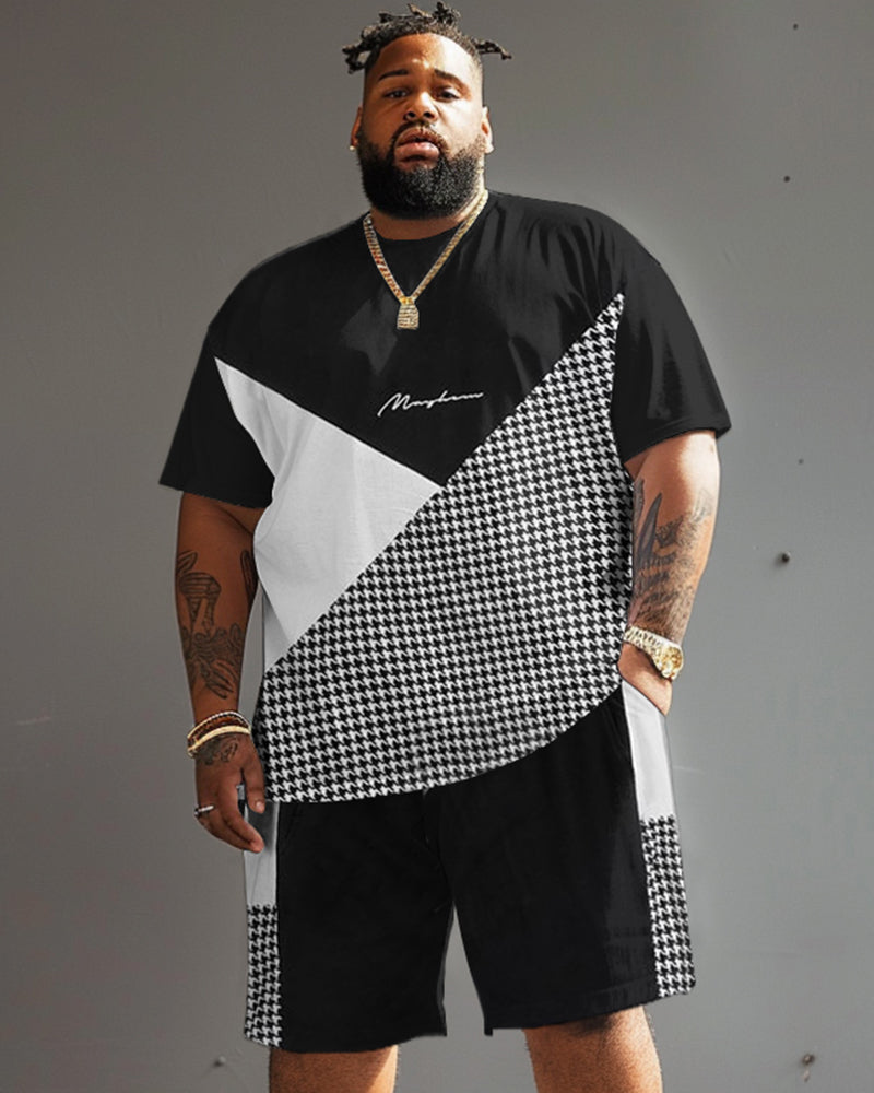 This big men’s two-piece set adopts a unique patchwork style design with houndstooth elements, not only classic and durable but also enhances the fashion sense. Its loose version design is comfortable and breathable, suitable for men of all shapes and sizes.