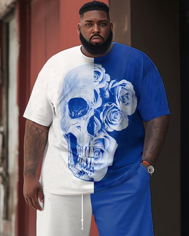 Merging street fashion with a romantic flair, this shorts set stands out in a bold blue-and-white color-block design. Featuring an intriguing mix of skull and rose prints, it's daring and romantic. This multi-element set is a perfect representation of individuality. Embrace your bold and romantic side with this striking, summer-ready ensemble.
