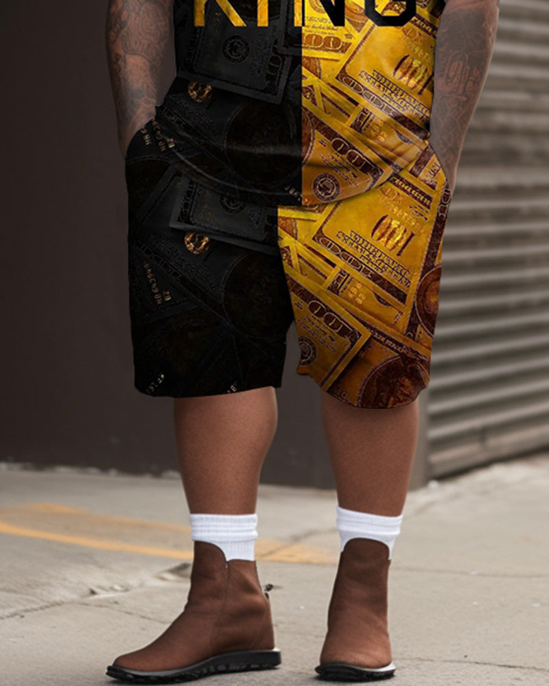 Wear this set and feel the luxury of cash. This men's shorts set combines gold and black in a patchwork style and uses cash throughout the design. The eye-catching "KING" word and exquisite print are unforgettable at first sight. The set adopts a loose version design and suit for many casual occasions, letting your style shine.