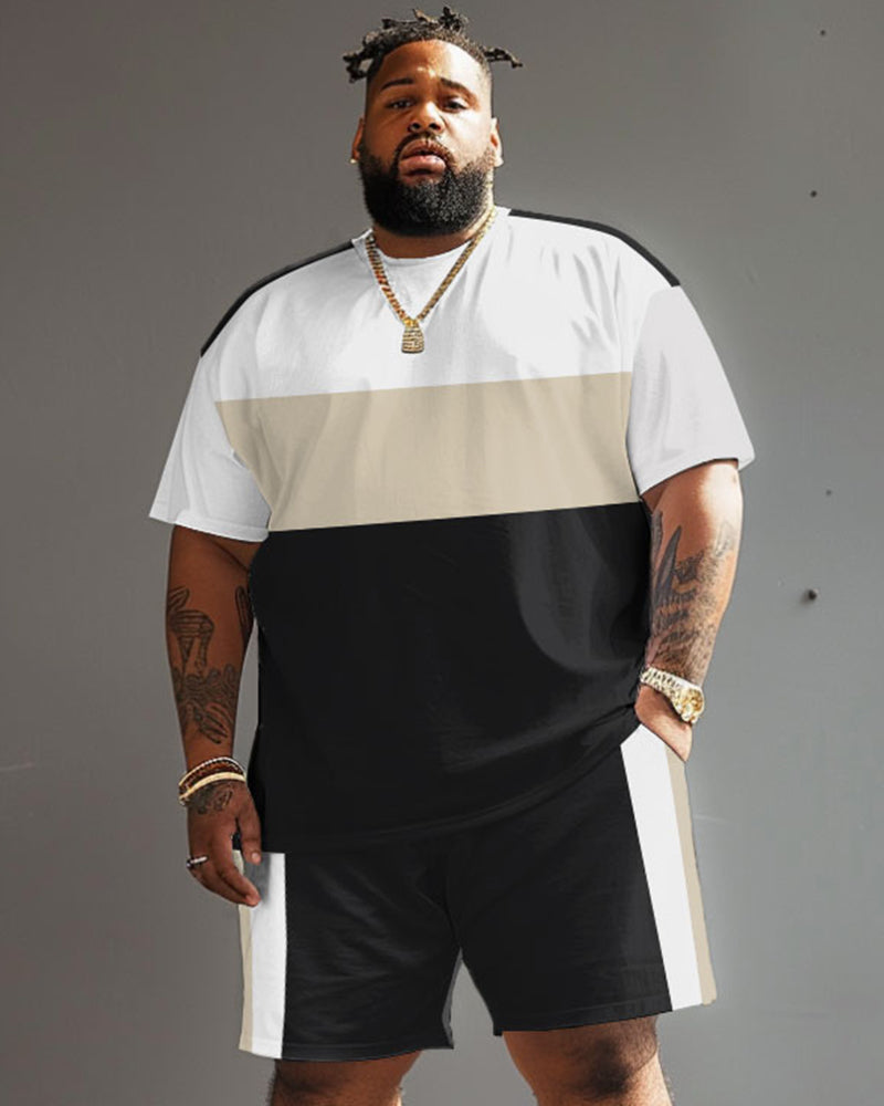 This big men's two-piece set is simple and stylish with a splicing style. With irregular color blocks and patching patterns, this set shows a unique fashion. The loose version ensures comfort and is suitable in spring and summer. Whether it is a casual party or daily travel, this set can easily show your unique style.