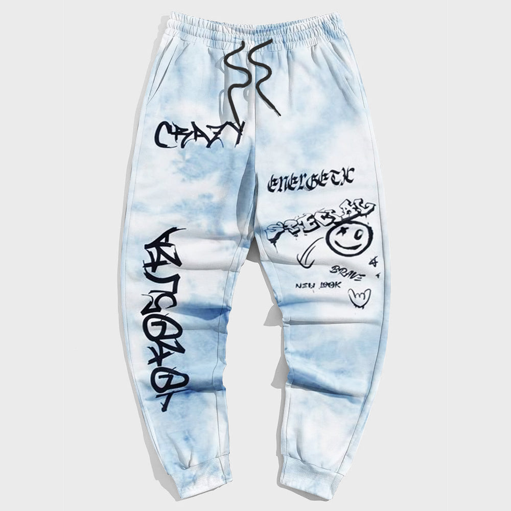 These big men's casual pants are designed in blue and white style. Embellished with smiley face graphics and inspiring slogans, they showcase a positive attitude. They're versatile and practical with elastic waistbands and adjustable drawstrings, balancing comfort and contemporary flair.