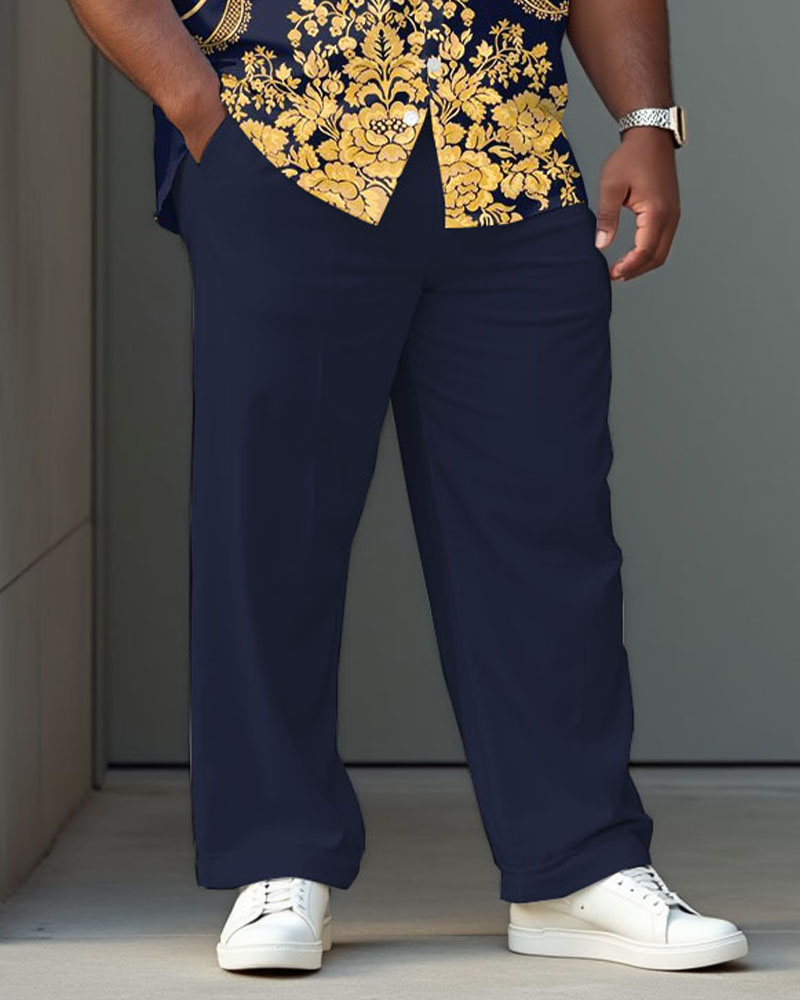 Vintage Dark Royal Blue Court Pattern Shirt Trousers Suit Men's Plus Size