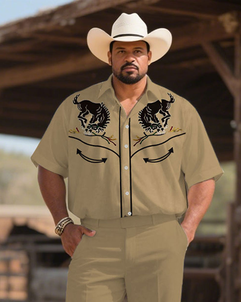 Western Denim-men's Plus Size Khaki Bullfight Pattern Symmetrical Printed Short Sleeve Shirt Trousers Suit