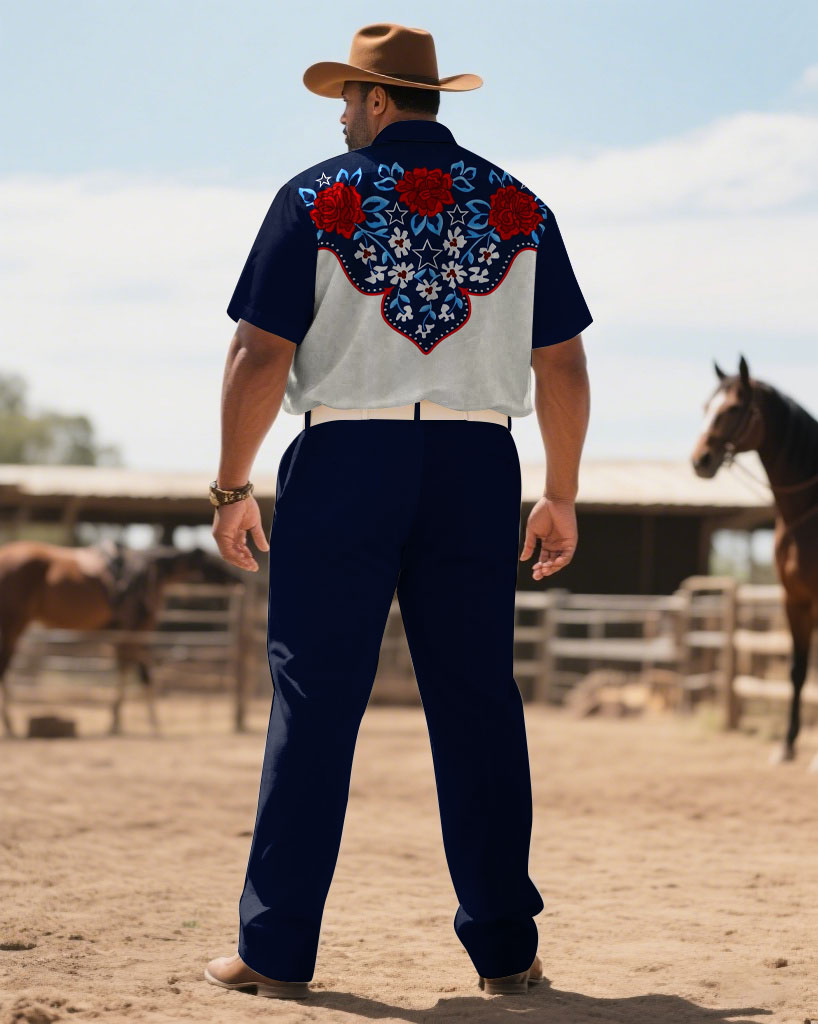 Western Denim-Men's Plus Size Royal Blue Floral Symmetrical Print Short Sleeve Shirt Trousers Suit