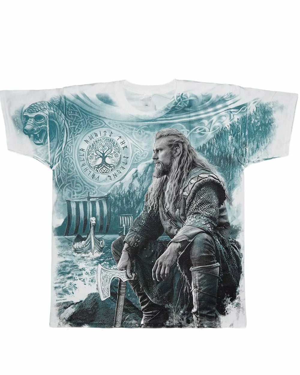 White T-shirt With A Viking Warrior Print In A Traditional Nordic Warrior Costume