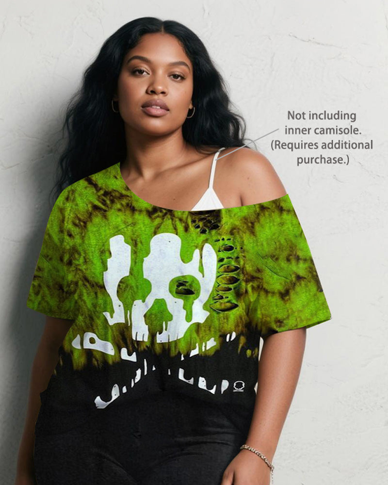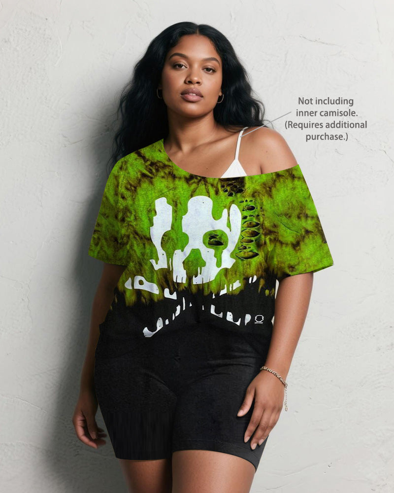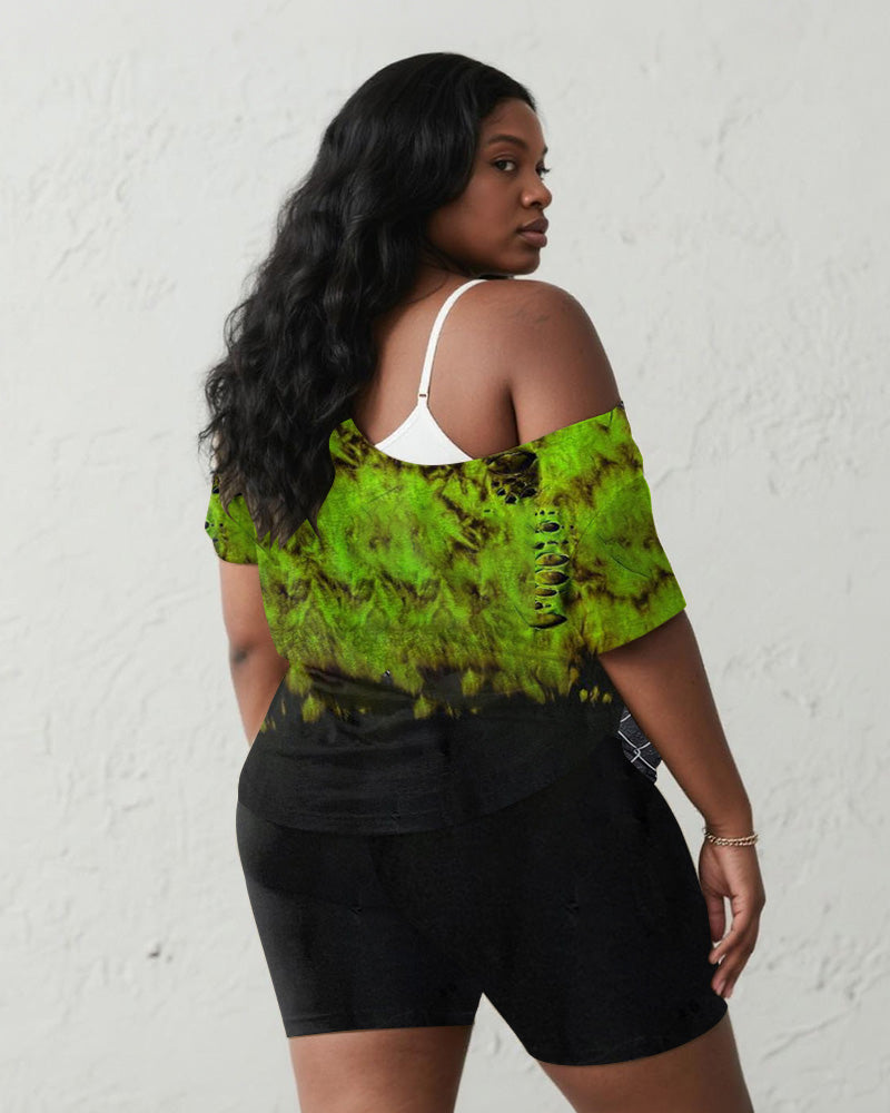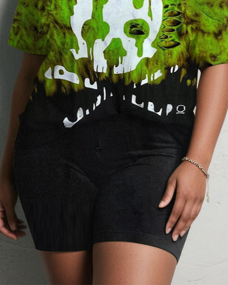 Women's Big & Tall Halloween Green Gradient Skull Print Short Sleeve Shorts Suit