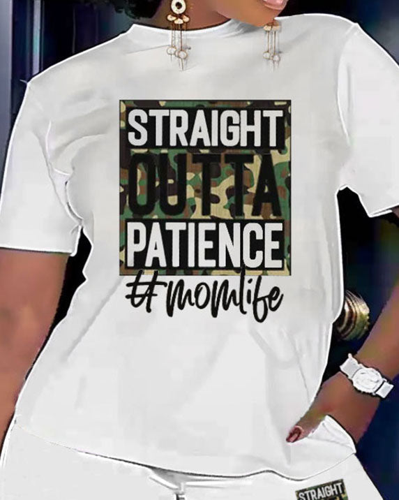 Embrace urban minimalism with this women's big & tall tee and shorts set, where "Straight Patience" typography meets camo patterns for an understated edge. The tailored shoulders and breathable fabric create a sleek silhouette that transitions effortlessly from brunch dates to weekend errands.
