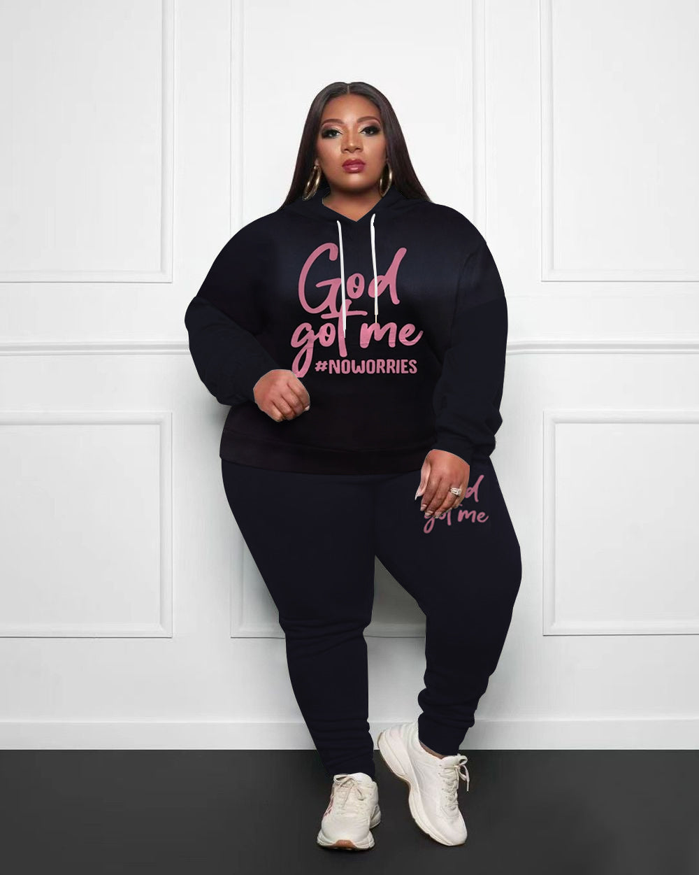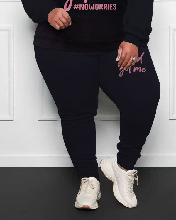 This is a text print praising God, hoping that we all have Jesus in our hearts, very suitable for plus-size ladies who believe in Christianity. Style: Hoodie Two Piece Set