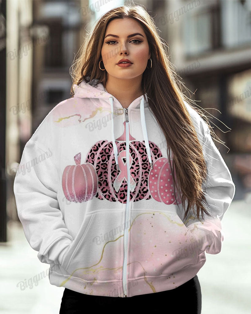Women's Plus Breast Cancer Awareness Pumpkin Print Long Sleeve Zipper Hoodie