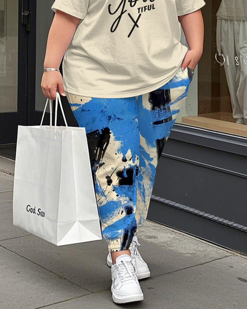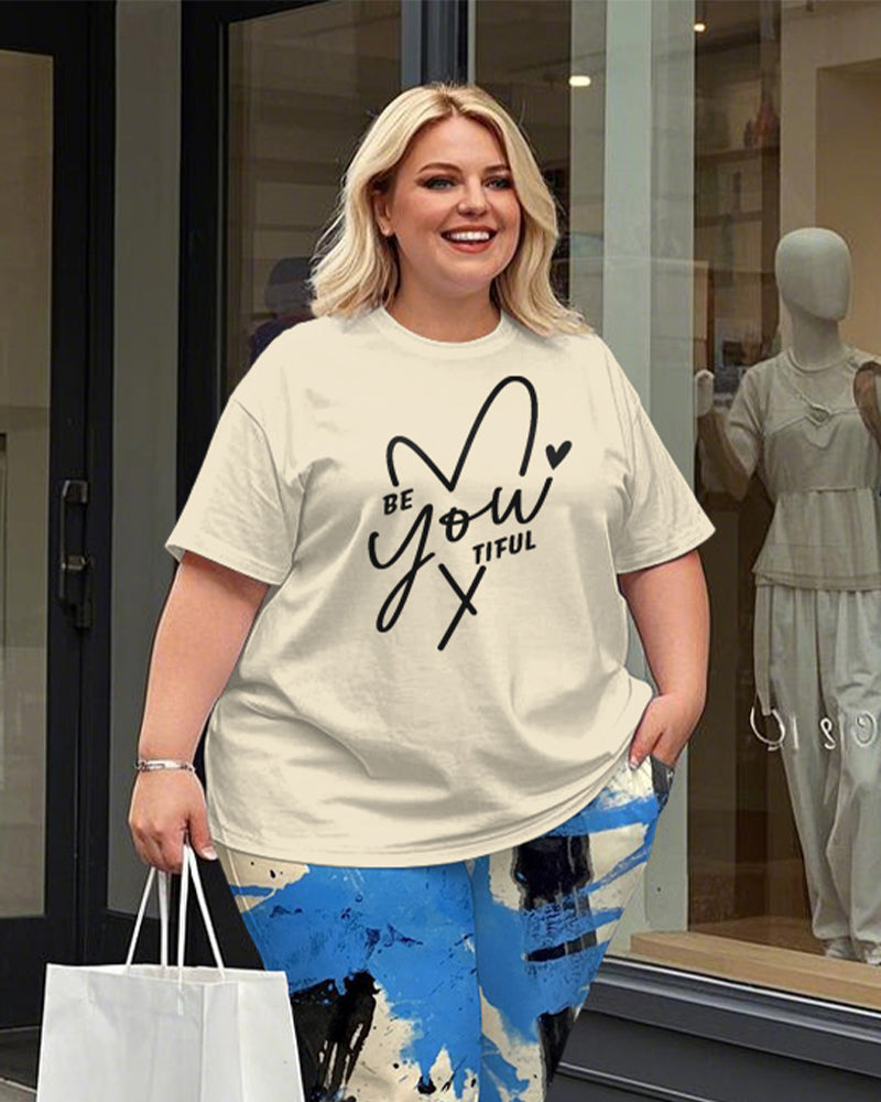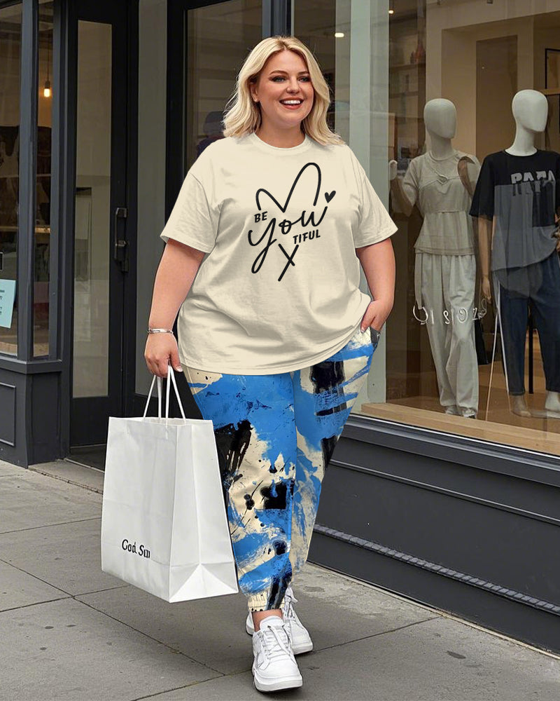 Women's Plus Size Be You Tiful Print T-Shirt and Graffiti Trousers Suit