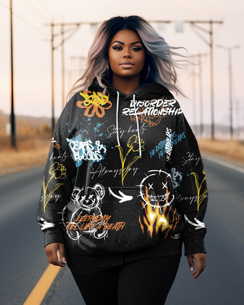 Women's Plus Size Cartoon Graffiti Graphic Long Sleeve Hoodie