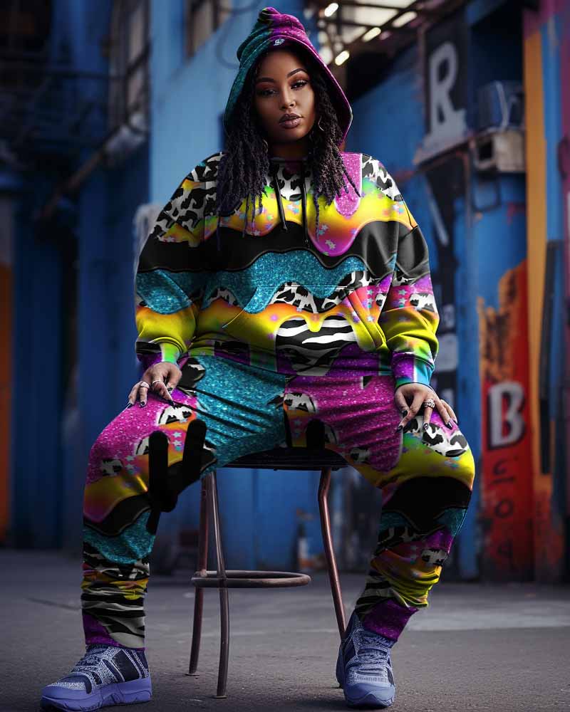 Women's Plus Size Colorful Milk Leopard Graffiti Hoodie Set