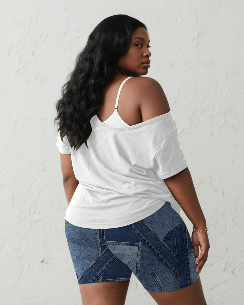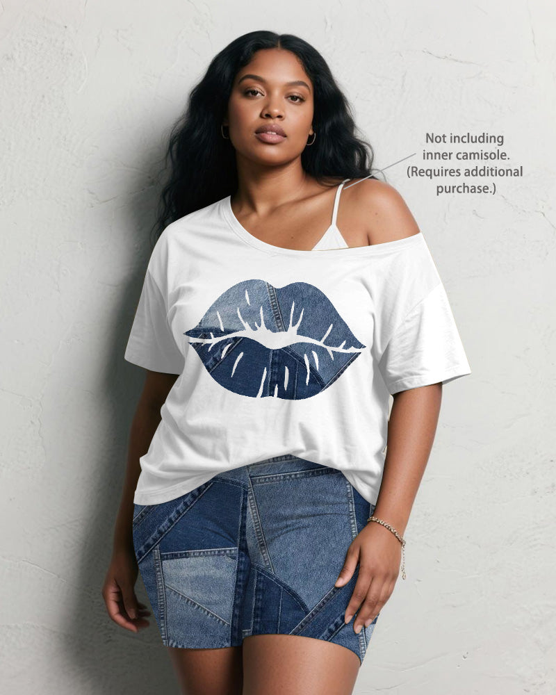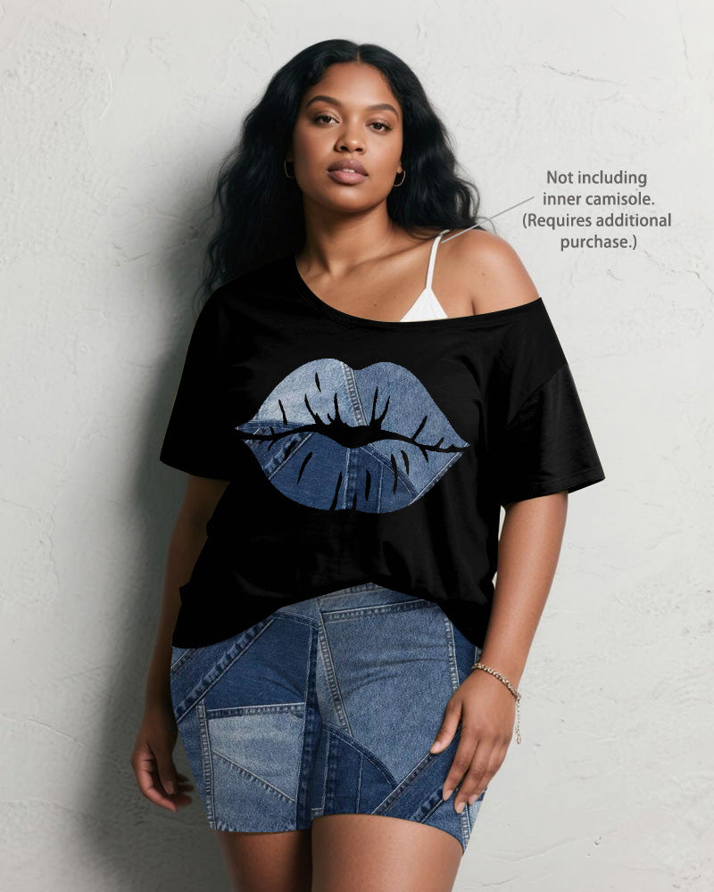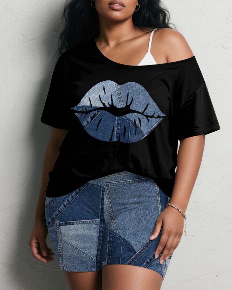 Women's Plus Size Daily Casual Lips Denim Print Short Sleeve Shorts Suit