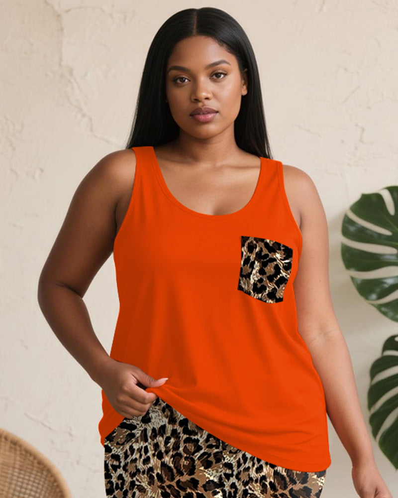 Women's Plus Size Daily Casual Orange Leopard Print Pocket Vest Shorts Suit