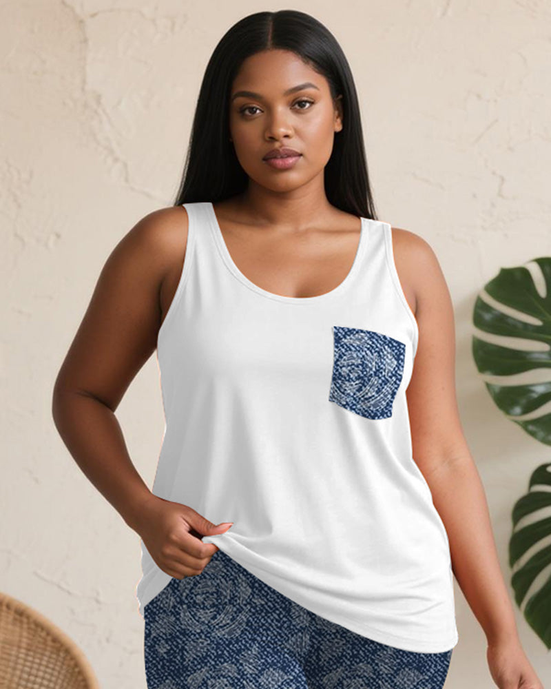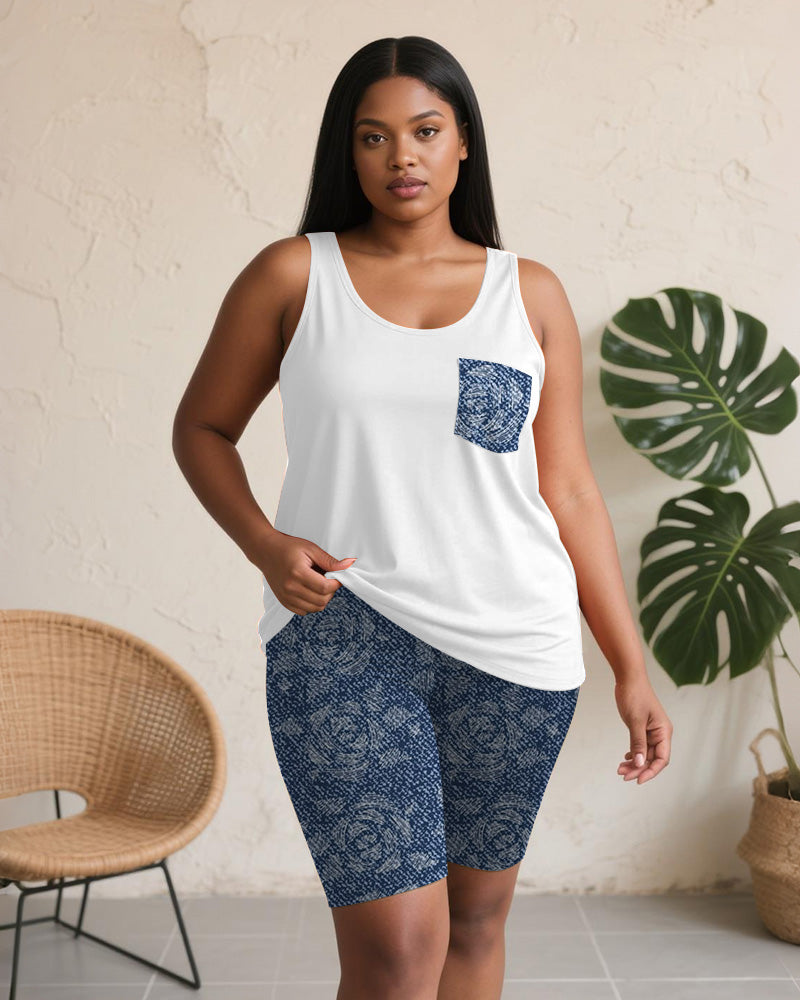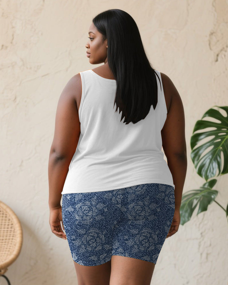 Women's Plus Size Daily Casual Rose Denim Print Pocket Vest Shorts Suit