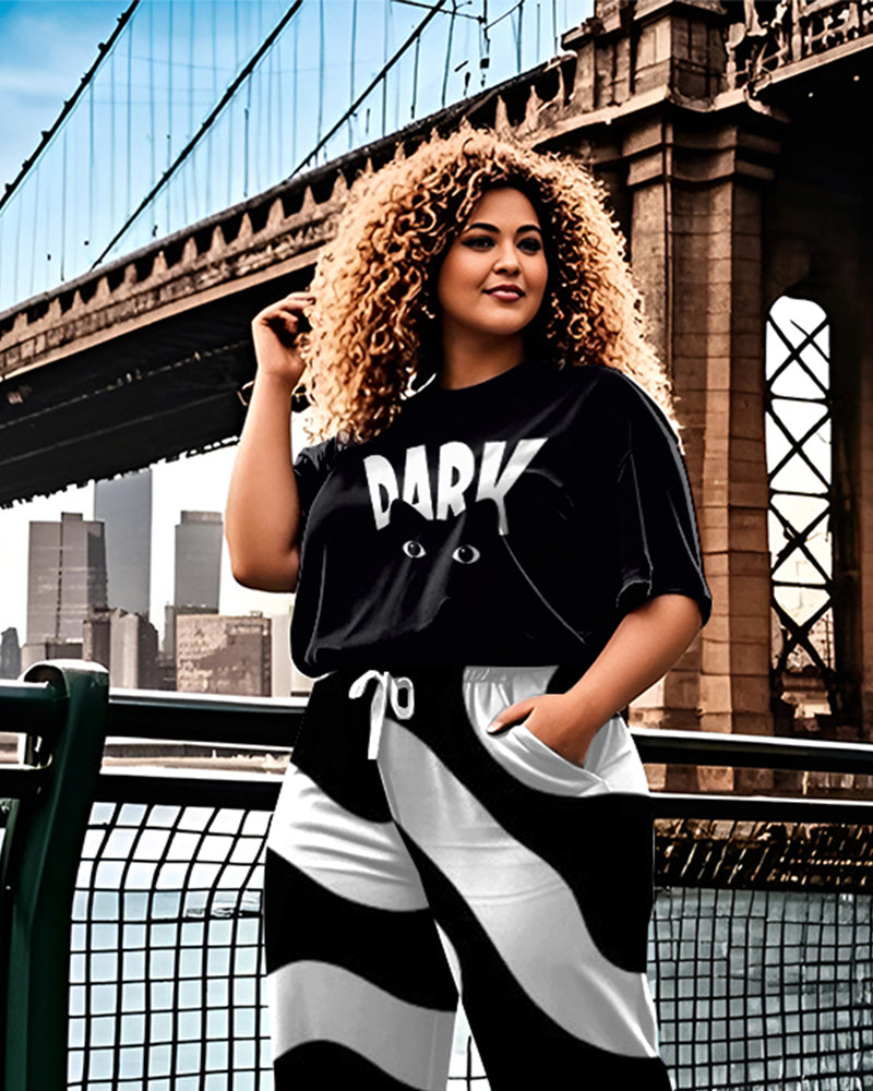 Women's Plus Size Fashion Cat Print T-Shirt and Ripple Trousers Suit