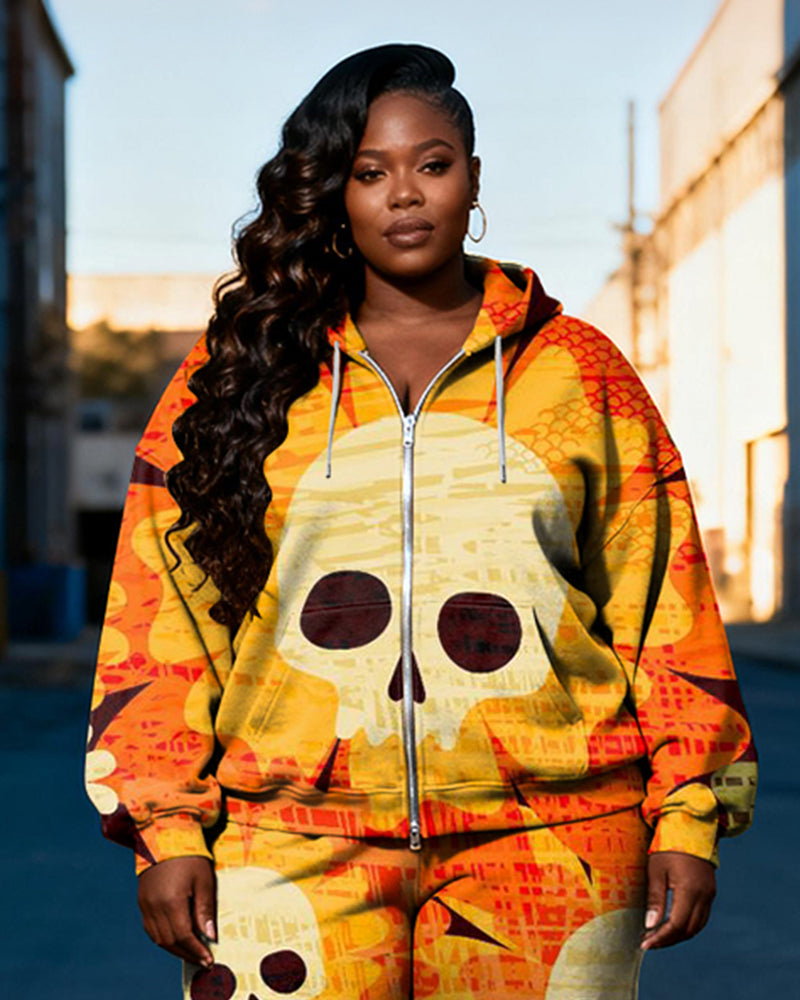 Women's Plus Size Halloween Orange Skull Floral Print Cardigan Hoodie Set