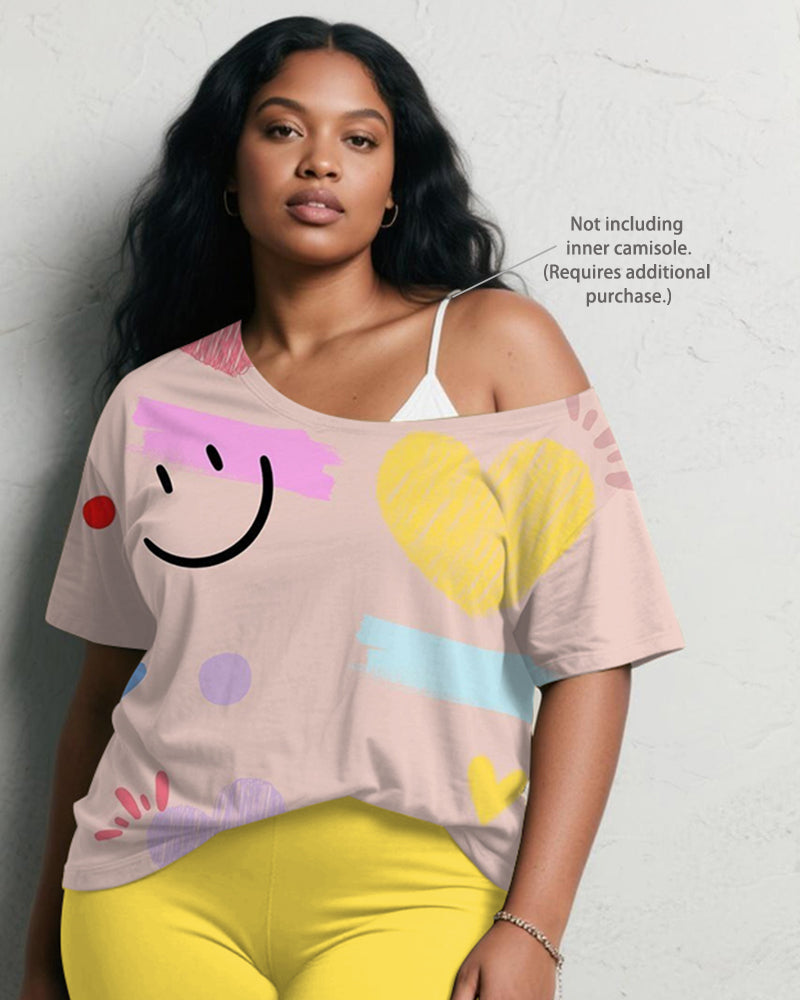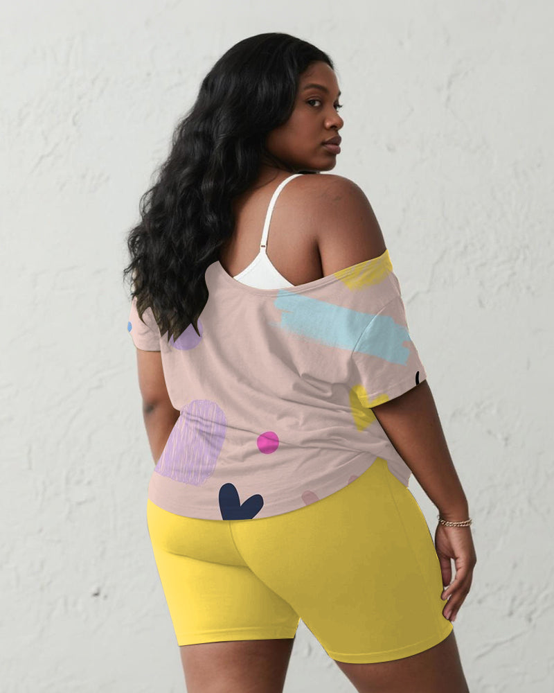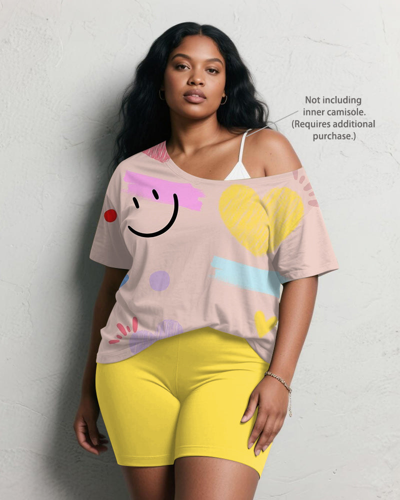 Women's Plus Size Pink Smiley Graffiti Print Short Sleeve Shorts Suit